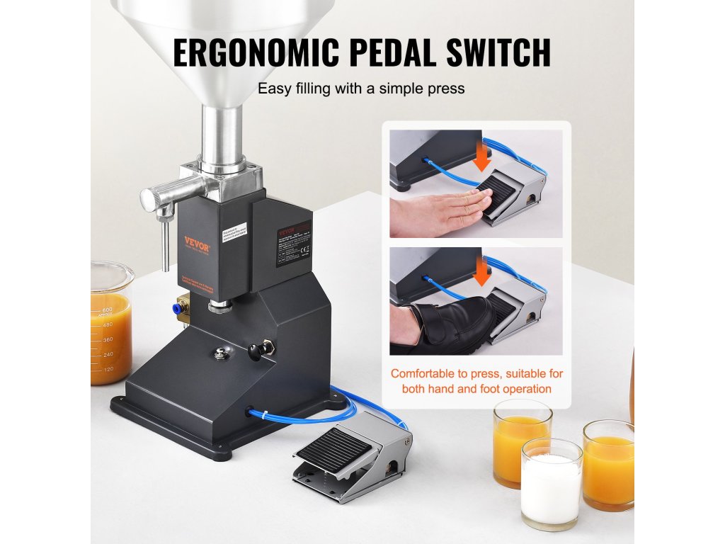 A folyadéktöltő lábkapcsolóval van ellátva. A kezével válthat palackot, miközben a lábával kopogtatva vezérelheti a töltési folyamatot. A kézi vezérlést is választhatja a lábpedál használatával. Az egyszerű kezelés garantálja a töltési hatékonyság jelentős növekedését.