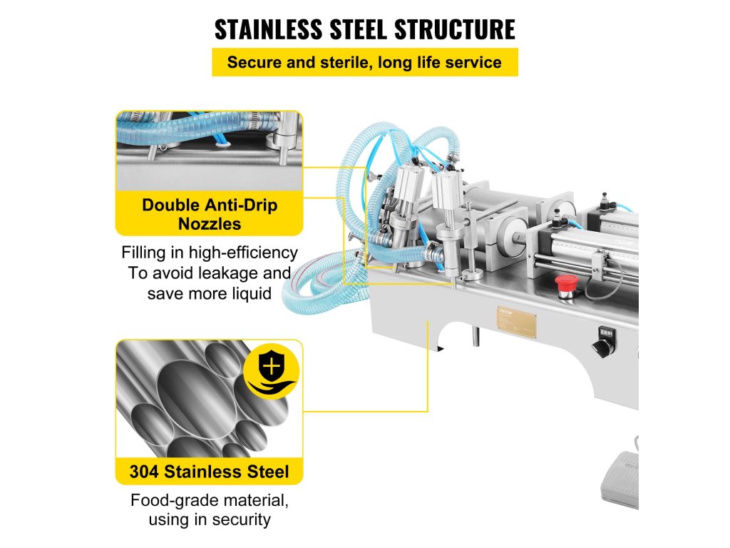A termékkel érintkező valamennyi alkatrész élelmiszeripari minőségű 304 rozsdamentes acélból készült. Rendkívül könnyen kezelhető, tisztítható és karbantartható. Ellenáll a korróziónak, savaknak és lúgoknak. A megvastagított alap és a teflon dugattyú kiváló minőségű.