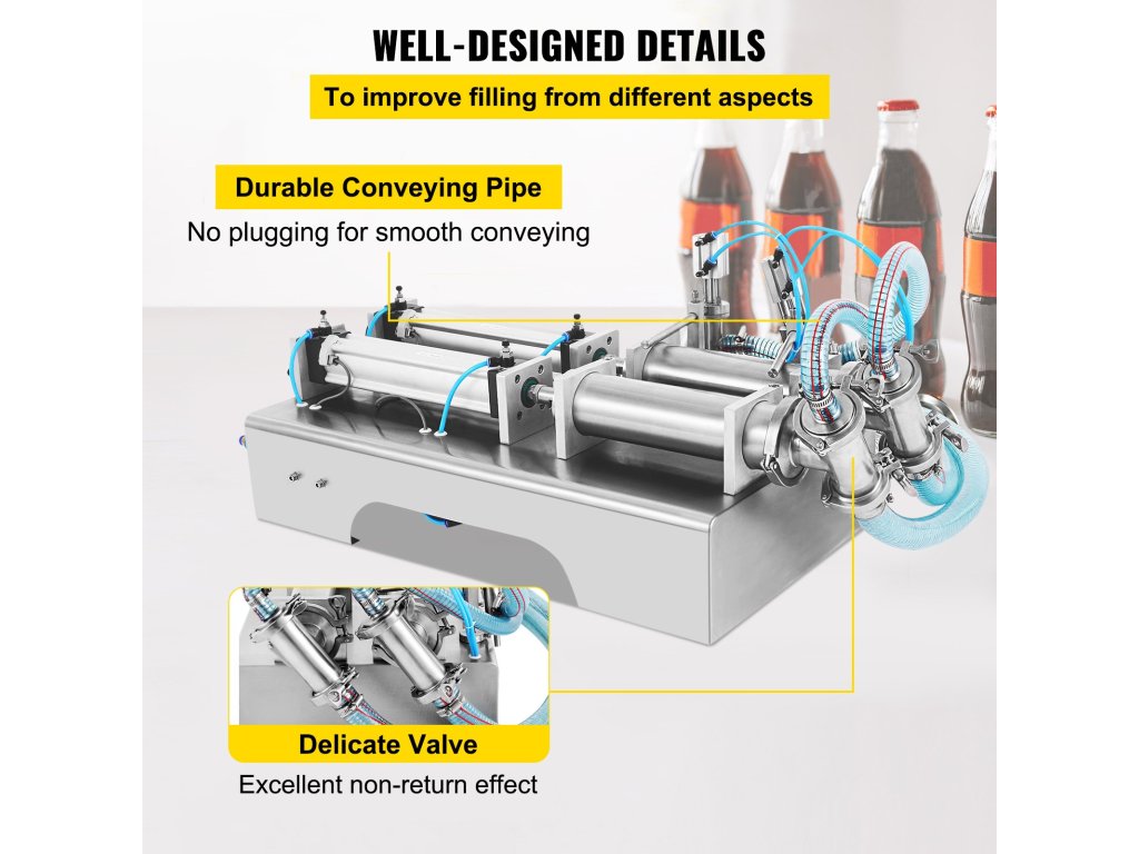 Ez a folyadék- és pasztatöltő gép prémium gázpalackot használ, amely hatalmas teljesítményű és stabil légnyomással rendelkezik. A töltési mennyiség és a töltési sebesség szabadon szabályozható. A töltési tartomány 3,4 - 33,8 oz/100 - 1000 ml, a töltési sebesség pedig maximum 80 palack/perc.
