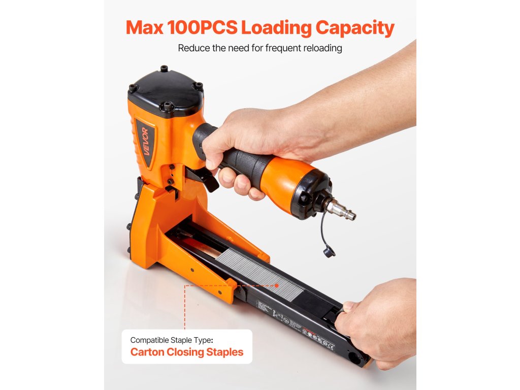 A nagy kapacitású, akár 100 tűzőkapcsot is befogadó tartályával felszerelt légtűzőgép a kartondugózáshoz minimálisra csökkenti a gyakori utántöltés szükségességét, és hatékonyabb működést tesz lehetővé. (A tűzőkapcsokat nem tartalmazza; kérjük, vásárolja meg külön)