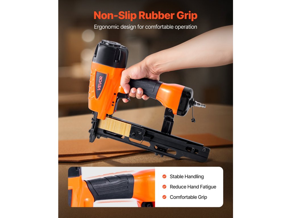 Pneumatikus tűzőgépünk biztonsági kioldókapcsolót tartalmaz a véletlenszerű elsütés megakadályozására, elforgatható kipufogó kialakítást, amely a levegőt a felhasználótól távolabbra irányítja, valamint védőszemüveget a szem védelme érdekében működés közben.