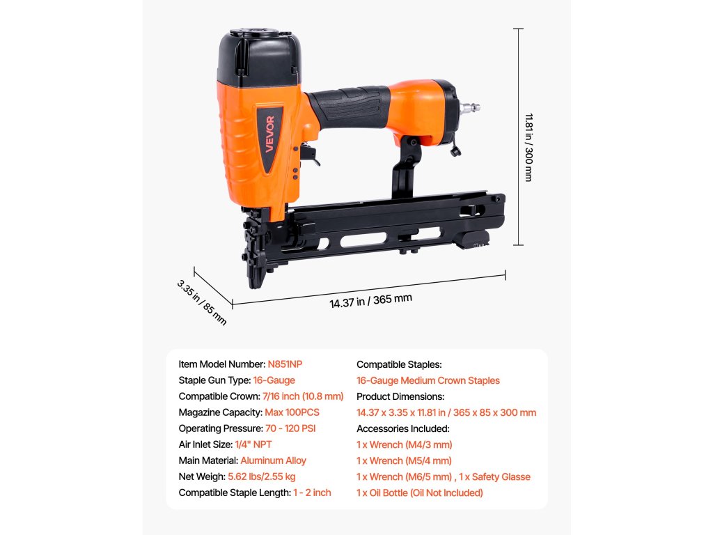 Ez a pneumatikus tűzőgép kompatibilis a 16 mm vastag, közepes koronájú tűzőkapcsokkal - 7/16" (10,8 mm) koronaszélességgel és 1" - 2" (25-50 mm) tűzőkapocshosszal. A nagy kapacitású újratölthető tálca egyszerre akár 100 tűzőkapocs tárolására is alkalmas, így tökéletesen ideális professzionális és barkácsprojektekhez.