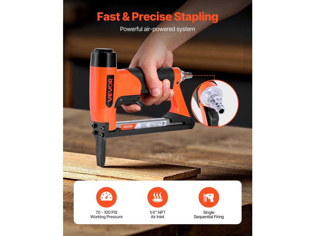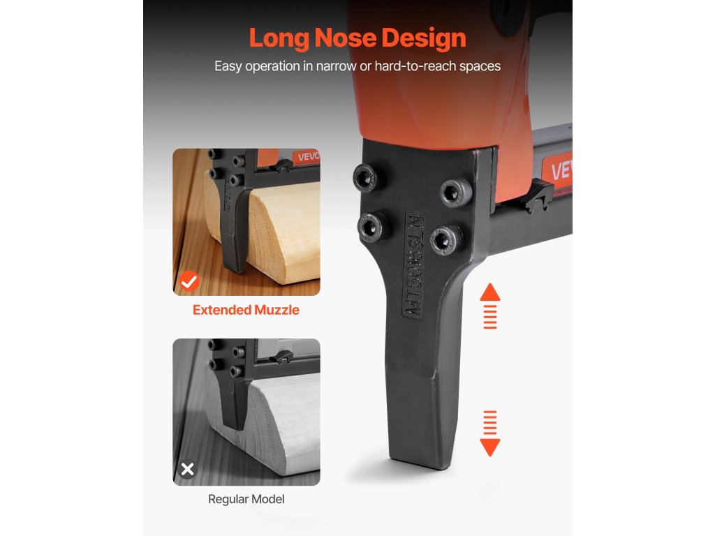 A meghosszabbított orral tervezett pneumatikus kárpitos pisztolyunk könnyű hozzáférést biztosít a szűk helyekre. Biztonsági kioldókapcsolóval, hátsó kipufogó kialakítással és szekvenciális tüzelési móddal is rendelkezik a nagyobb biztonság érdekében.