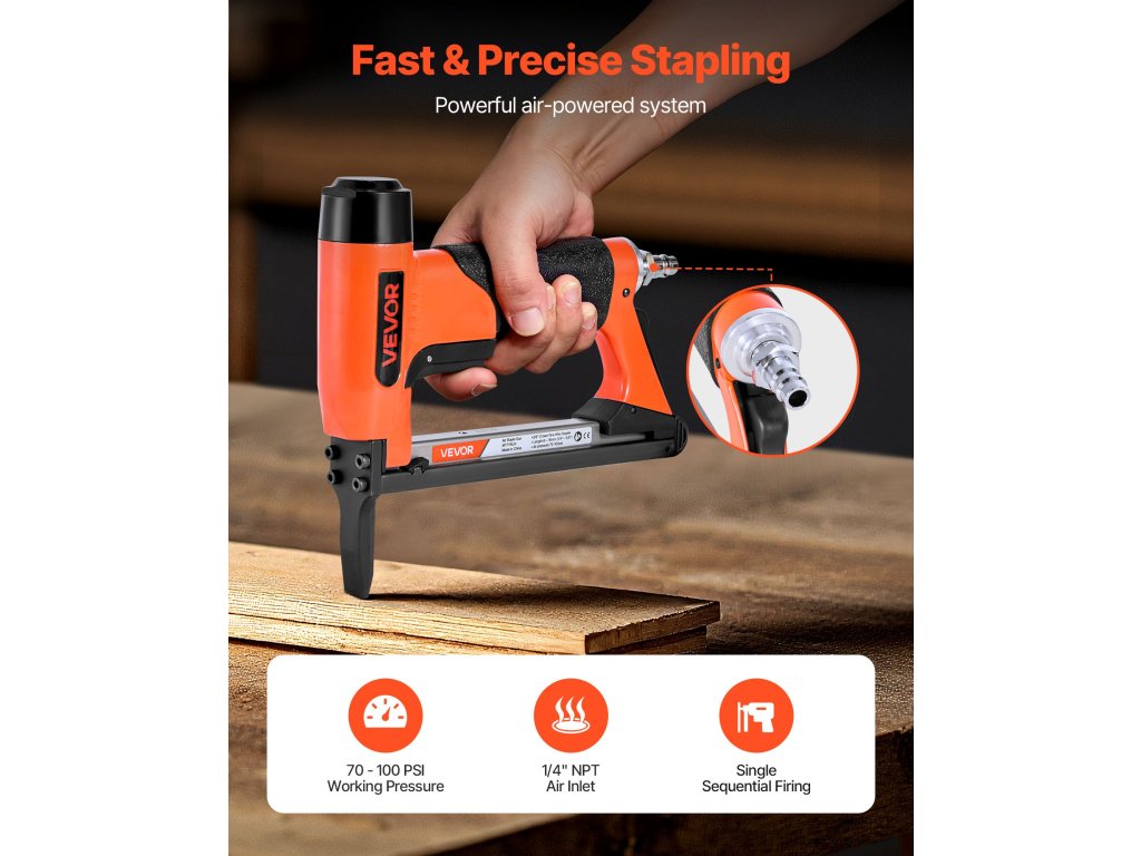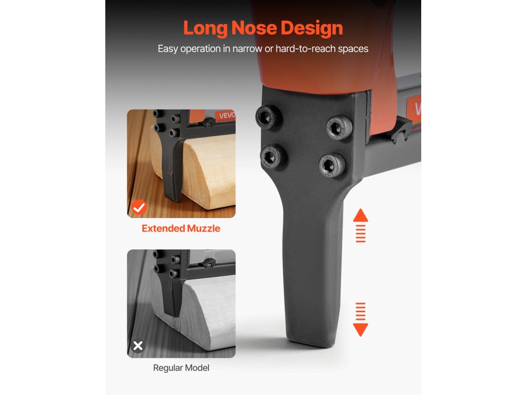 A meghosszabbított orral tervezett pneumatikus kárpitos pisztolyunk könnyű hozzáférést biztosít a szűk helyekre. Biztonsági kioldókapcsolóval, hátsó kipufogó kialakítással és szekvenciális tüzelési móddal is rendelkezik a nagyobb biztonság érdekében.