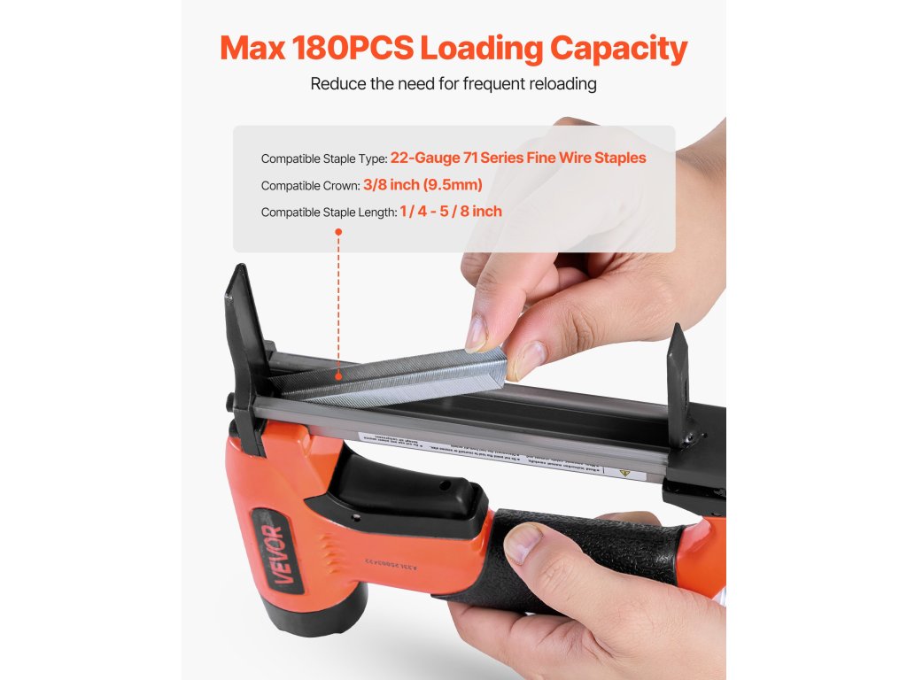 A nagy kapacitású, egyszerre akár 180 tűzőkapcsot is befogadó újratöltő tartályával felszerelt légkapocsvető pisztoly minimalizálja a gyakori újratöltés szükségességét, és hatékonyabb működést tesz lehetővé. (A tűzőkapcsok nem tartoznak a csomagba; kérjük, vásárolja meg külön.)