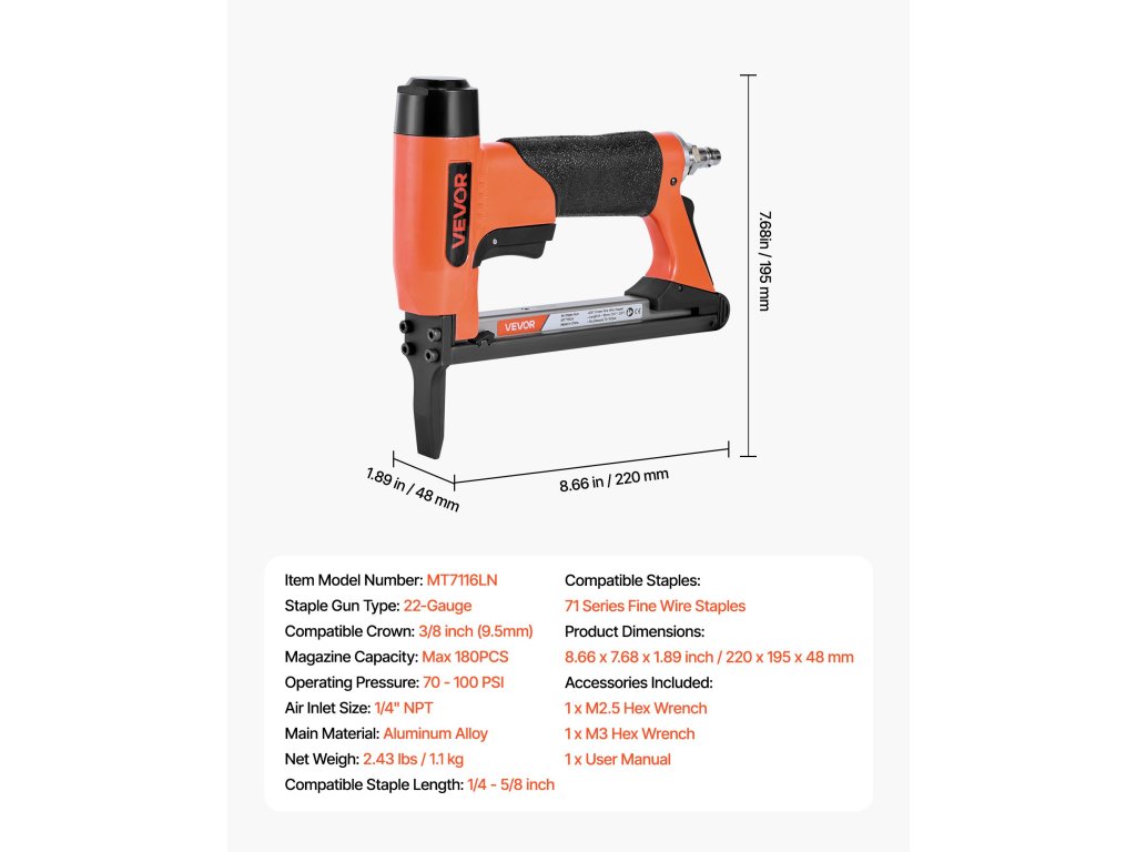 Ez a 22 mm átmérőjű pneumatikus tűzőgép kompatibilis a 71-es sorozatú finom drótkapcsokkal - 3/8" (9,5 mm) koronamérettel és 1/4" és 5/8" (6-16 mm) közötti tűzési hosszal. A nagy kapacitású újratölthető tárban akár 180 tűzőkapocs is elfér, ideális kárpitozáshoz, asztalosmunkához, bútorkeretezéshez és fa összeszereléshez.