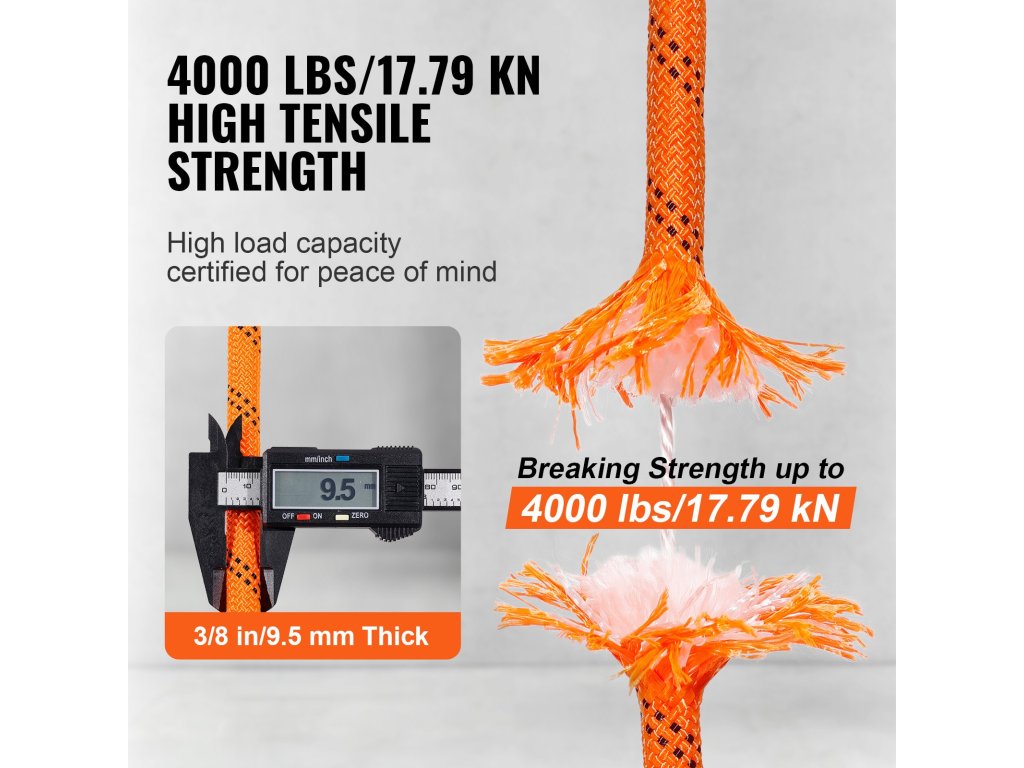A fonott poliészter kötél átmérője 3/8 in/9,5 mm, és 4000 lbs/17,79 kN szilárd szakítószilárdsággal büszkélkedhet. Olyan, mintha két autó erejét tartanád a kezedben!