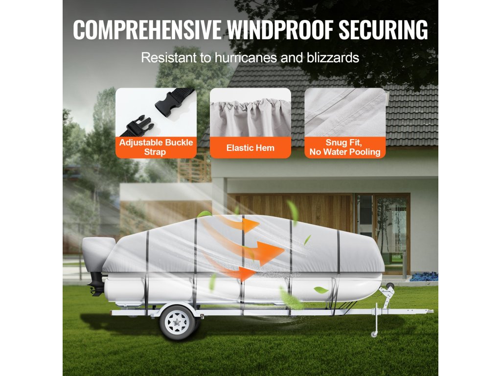 A hajófedél (hossza: legfeljebb 19 láb - 20 láb; szélesség: legfeljebb 96 hüvelyk) 800D tengeri minőségű oxford szövetből készül. PU bevonattal feljavítva 100%-os vízállósággal és napfényállósággal büszkélkedhet. A borításba öntött vízálló szalag biztosítja, hogy a víz ne tudjon áthatolni rajta.