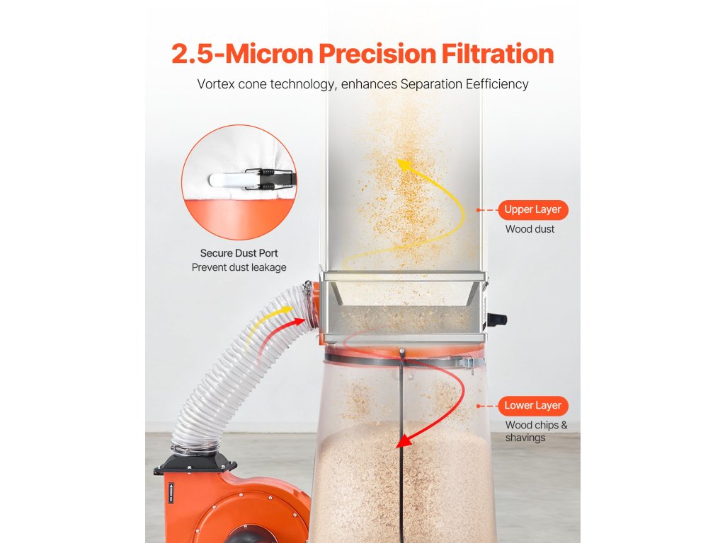 A 42 gallonos (159 literes) porelszívónk nagy teljesítményű 1200CFM elszívással, 2,0 LE nagyteljesítményű motorral és 2,5 mikronos szűréssel rendelkezik. A kompakt, falra szerelhető kialakítás alsó görgőkkel és nagy gyűjtőzsákkal egyszerűsíti a porkezelést, és rendezetté és hatékonnyá teszi a famegmunkálási területeket.