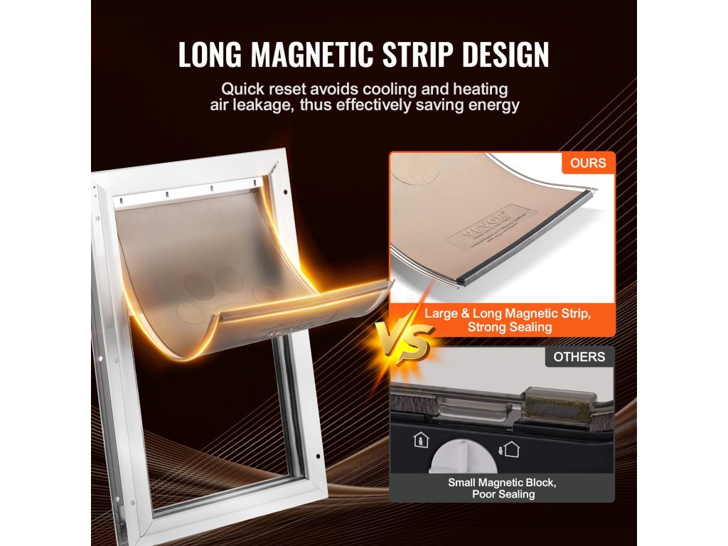 A hosszú mágnescsík szorosan illeszkedik, és mindössze három másodperc alatt visszaáll. Ez a kialakítás megakadályozza a hideg levegő vagy a hő távozását, hatékonyan blokkolja a belső hőmérsékletet és csökkenti az energiapazarlást, így ideális cserepajzs a kutyaajtókhoz.