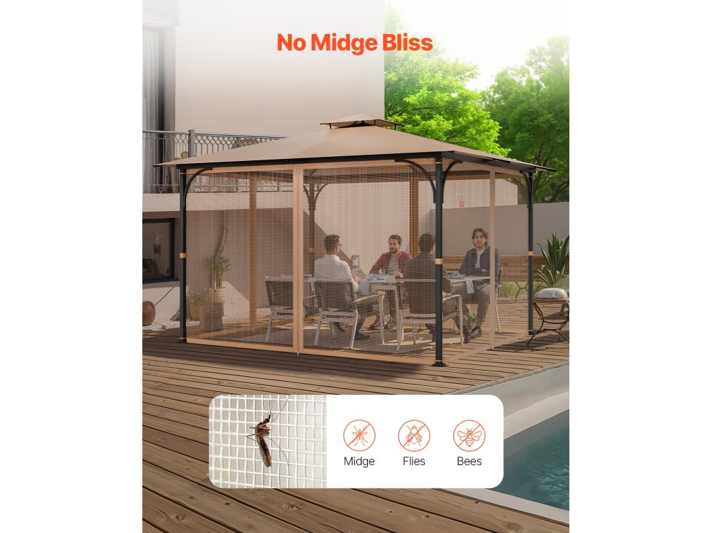 Ez a 10×12×7,3 láb méretű csere pavilonháló 100% poliészterből készült, a pavilonodra szabottan. Puha, könnyű és szakadásálló, hatékonyan megakadályozza a legyek bejutását a kertjébe. Ideális kerti grillezésekhez vagy kerti partikhoz, és kellemes szabadtéri ülőhelyet biztosít.