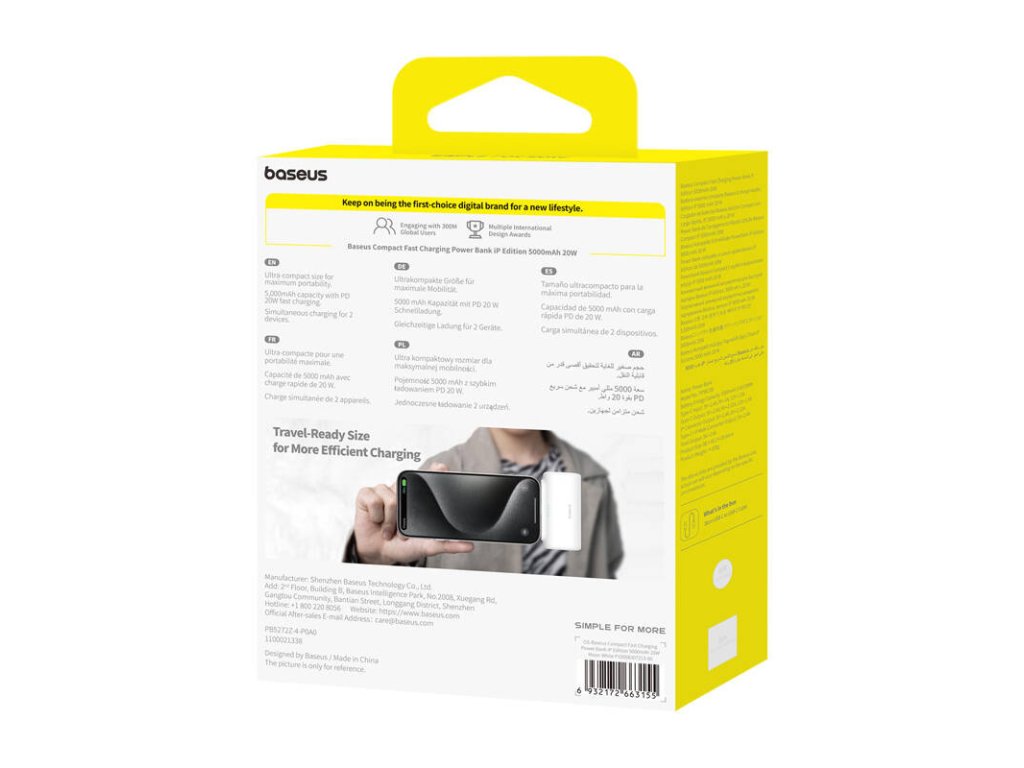 A Baseus Compact kétféleképpen használható. Integrált USB-C csatlakozóval rendelkezik, amely kompatibilis a piacon kapható legnépszerűbb mobileszközökkel, így közvetlenül csatlakoztathatod az eszközeidhez, vagy használhatod a készletben található kábelt. Legyen szó iPhone 15 szériáról, Samsung S22/S23-ról, OnePlus 8 Pro-ról vagy Google Pixel 7Pro-ról, ez a power bank minden eszközzel megbirkózik.