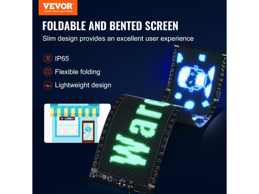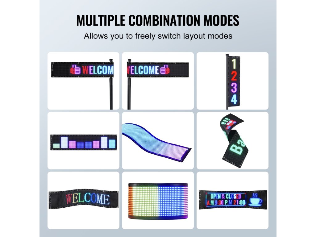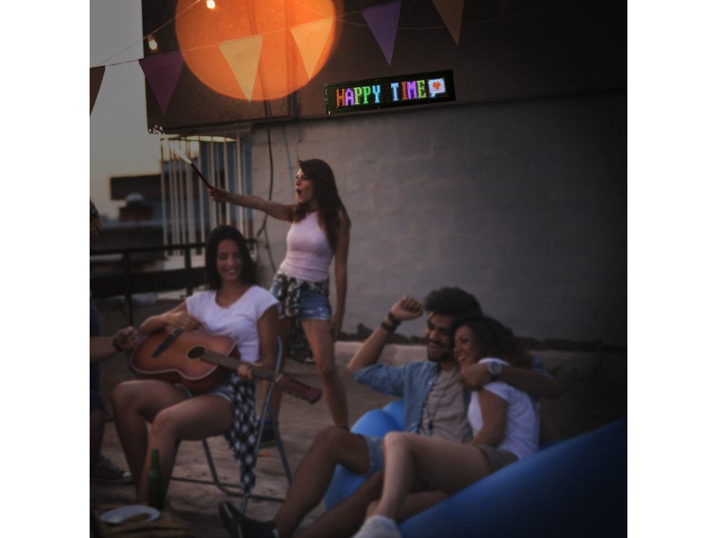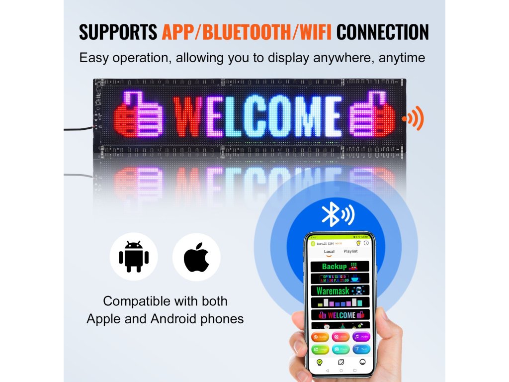 Az alkalmazáshoz Bluetooth-on keresztül csatlakozva vezérelhető, és egyszerre több LED-kijelzőhöz való csatlakozást is támogat, így üzletét még figyelemfelkeltőbbé teszi. Támogatja a gördülő szöveg, dátumok, időpontok, képek és videók megjelenítését, színes, dinamikus szövegmegjelenítésekkel vonzza a járókelők figyelmét.