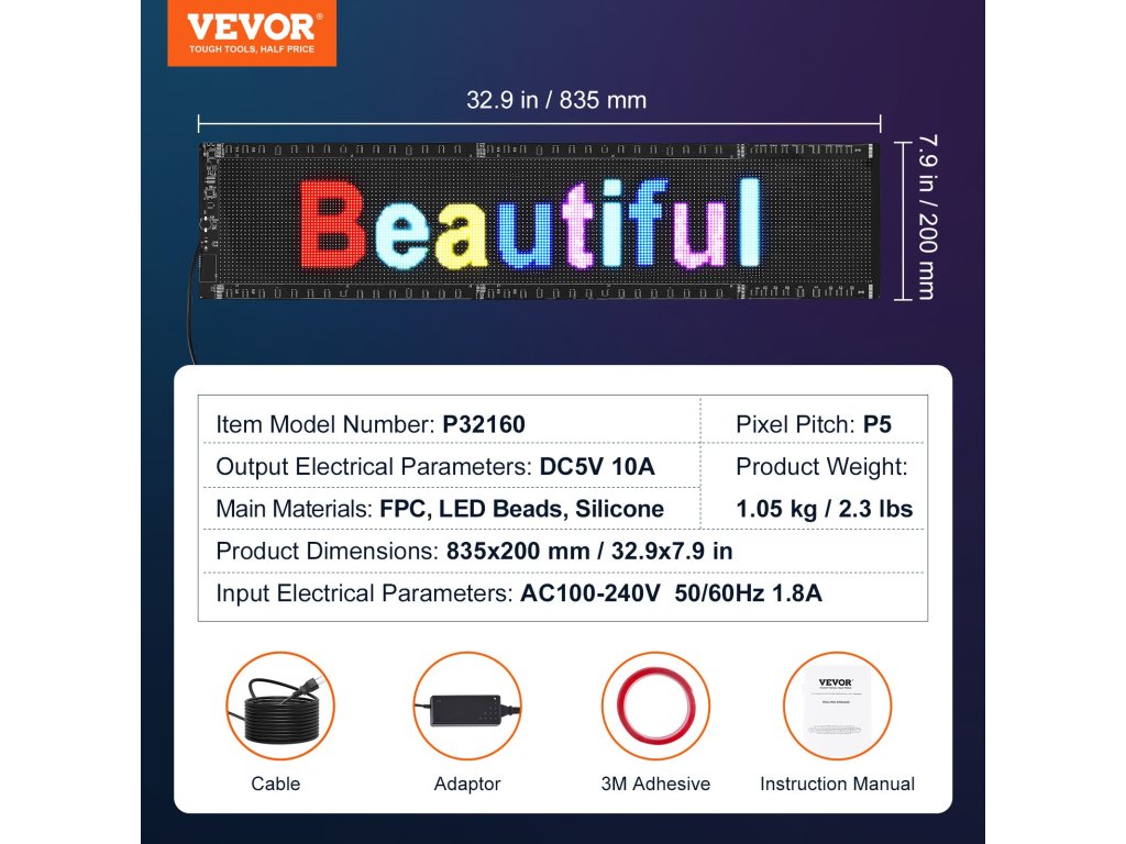 Programozható, színes LED panel p5, 83,5 × 20 cm, Bluetooth