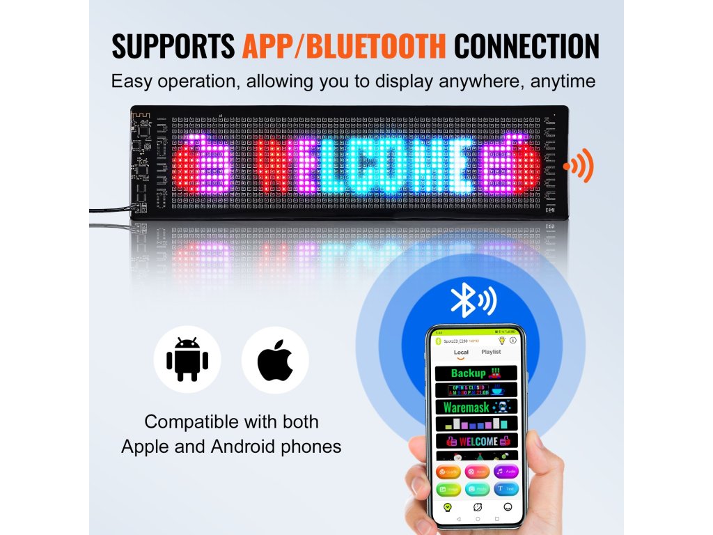 Az alkalmazáshoz Bluetooth-on keresztül csatlakozva vezérelhető, és egyszerre több LED-kijelzőhöz való csatlakozást is támogat, így üzletét még figyelemfelkeltőbbé teszi. Támogatja a gördülő szöveg, dátumok, időpontok, képek és videók megjelenítését, színes, dinamikus szövegmegjelenítésekkel vonzza a járókelők figyelmét.
