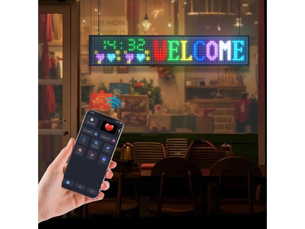 Ez a programozható led tábla alkalmas üzletek, szállodák, kirakatok, bevásárlóközpontok, otthonok, irodák, kávézók, bárok, éttermek stb. számára. Használhatja reklámozásra és promócióra.