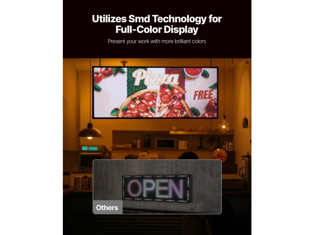Az SMD-technológiát használó színes LED-reklámtáblák jobban megjelenítik munkáját, és növelik láthatóságát bevásárlóközpontokban, szupermarketekben és kirakatokban a legkülönbözőbb kereskedelmi környezetekben.
