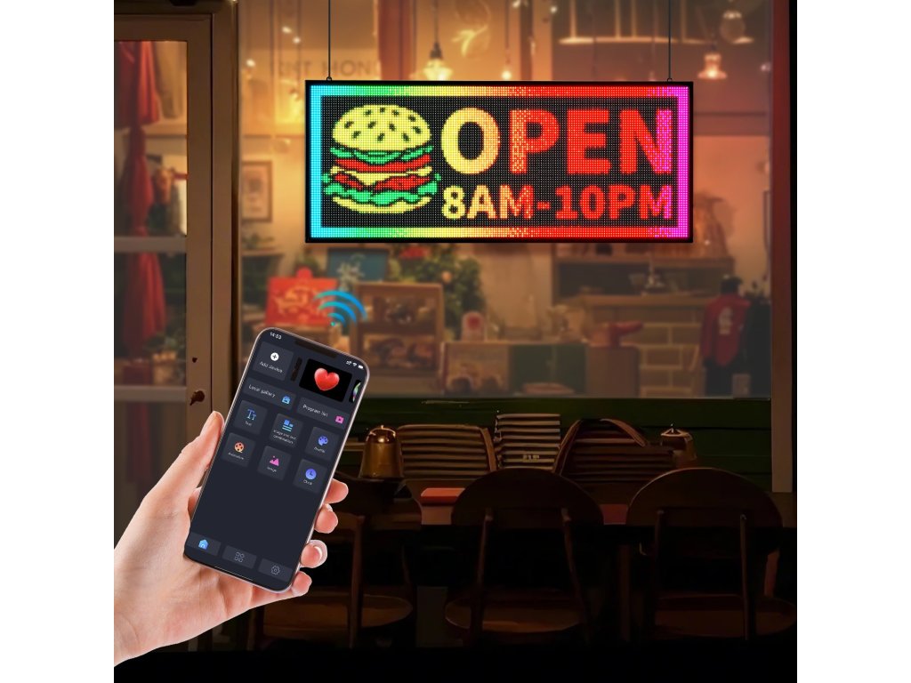 Ez a programozható led tábla alkalmas üzletek, szállodák, kirakatok, bevásárlóközpontok, otthonok, irodák, kávézók, bárok, éttermek stb. számára. Használhatja reklámozásra és promócióra.