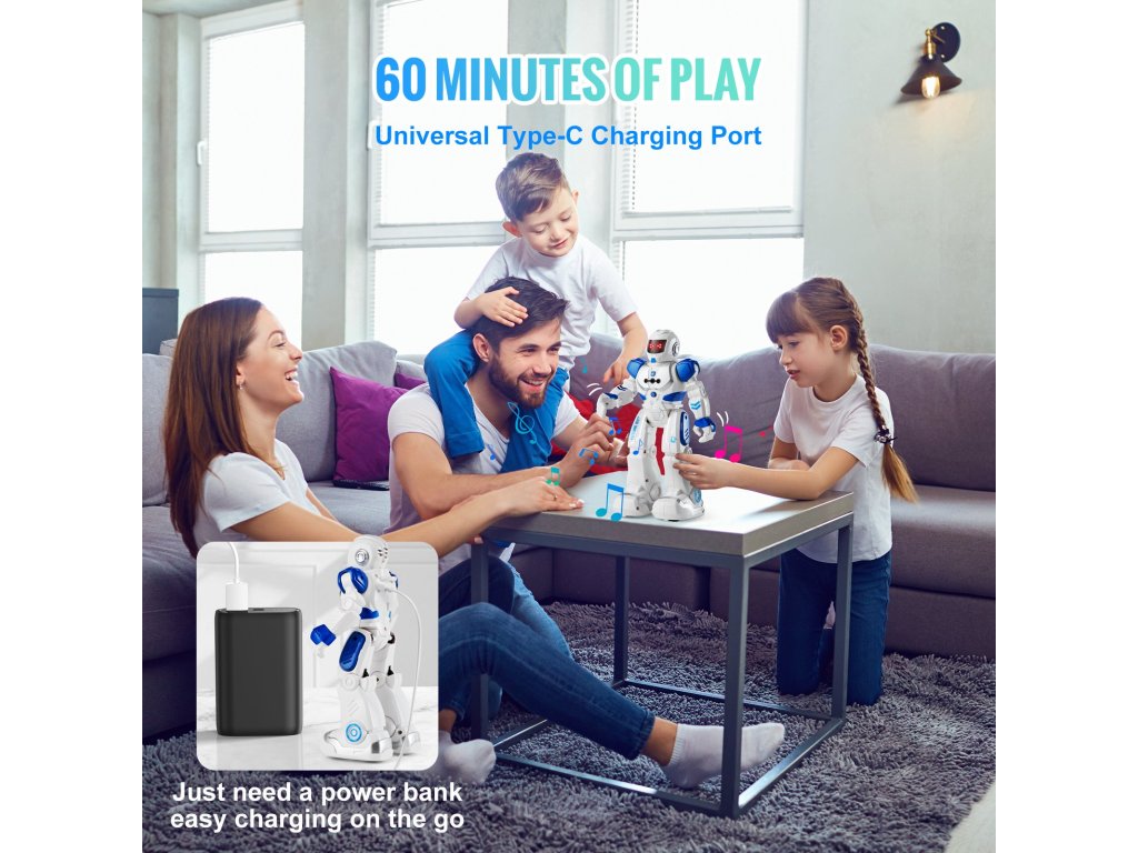 A robotjáték könnyen feltölthető USB-n keresztül. Hosszú élettartamú akkumulátorral rendelkezik, amely bármikor készen áll a szórakozásra, akár bent, akár kint.