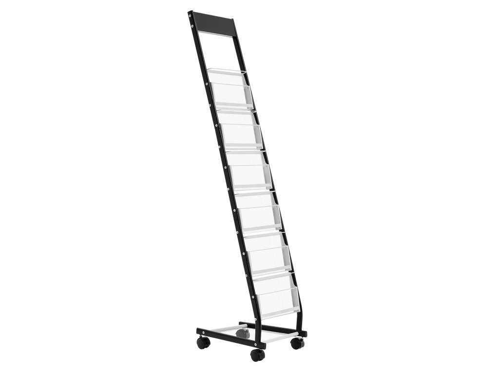 Prospektustartó állvány, fém, 6 rekesszel, kerekeken álló