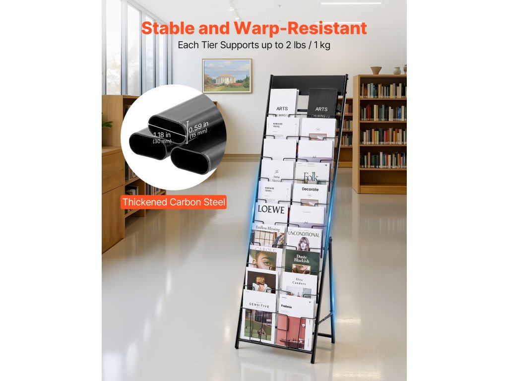 Minden egyes réteg akár 2 font/1 kg-ot is elbír, így könnyedén megtámasztja a különböző vastagságú dokumentumokat, anyagokat és brosúrákat. Még több egymásra helyezett mappa esetén is szilárdan áll az irodalom bemutató állvány, anélkül, hogy félnie kellene a leeséstől vagy a borulástól. Az erős teherbírás garantálja a stabilitást és a megbízhatóságot.