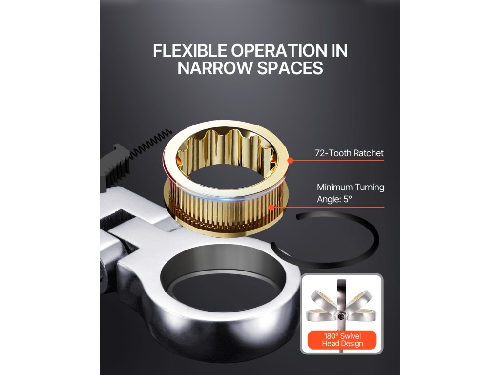 Rugalmas fejjel ellátott racsnis kulcskészletünk ergonomikus kialakítású, amely kényelmes fogást biztosít a könnyű használat érdekében.
