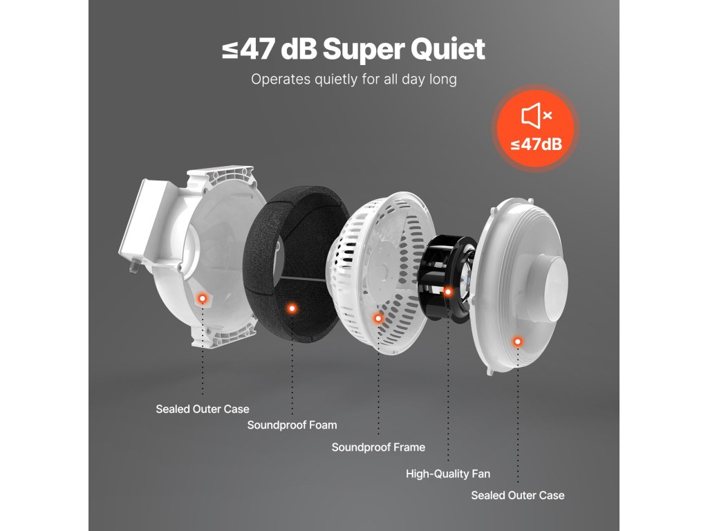 A nyugalom érdekében tervezett ventilátor mindössze 47 dB zajszint mellett működik, így biztosítja a zavartalan alvást és munkát, és lehetővé teszi, hogy Ön nyugodt életkörülményeket élvezhessen.