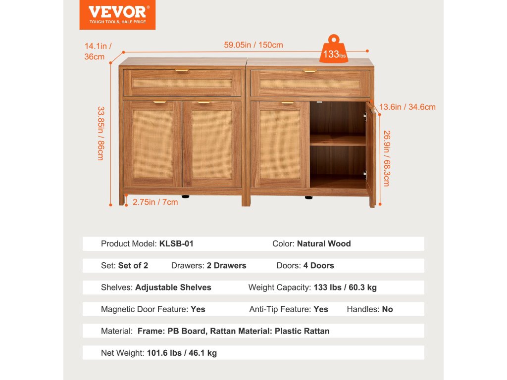 A büfé szekrényünk terhelhetősége legfeljebb 60,3 kg (133 font). A szekrényhez egy felborulásgátló készlet tartozik, és a használat előtt feltétlenül telepítse a felborulásgátlót a nagyobb stabilitás és biztonság érdekében.