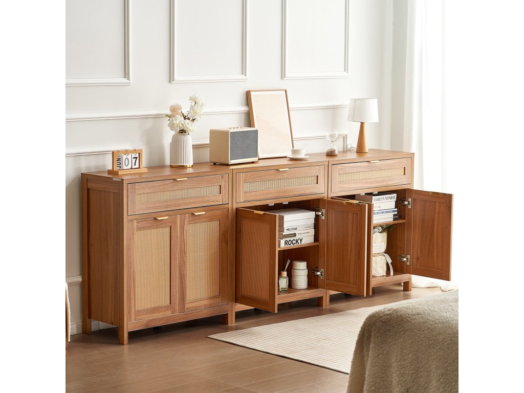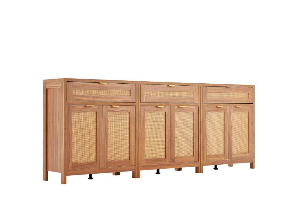 Ez a rattan komód tökéletes tárolási megoldást kínál, alkalmas konyhai komódként, bárszekrényként, tárolóegységként vagy cipős szekrényként az előszobában. Sokoldalú kialakításának köszönhetően különböző környezetekhez igazítható, és egyszerre szolgál tárolóegységként és dekoratív darabként.