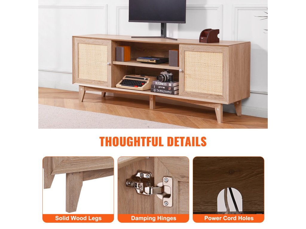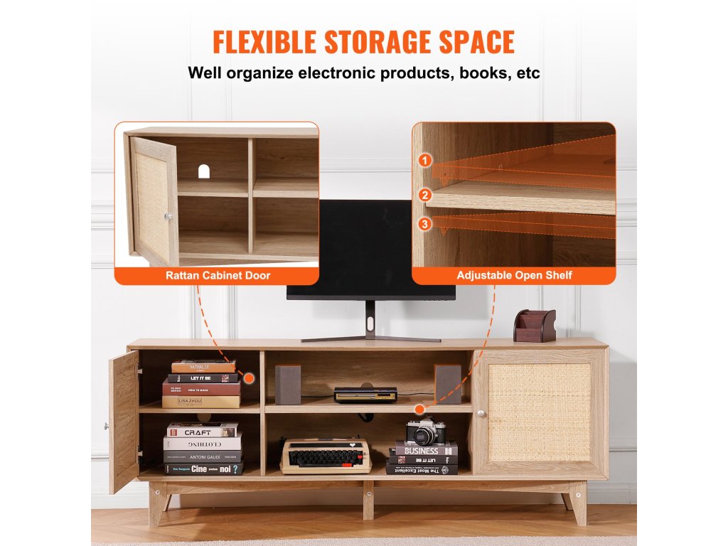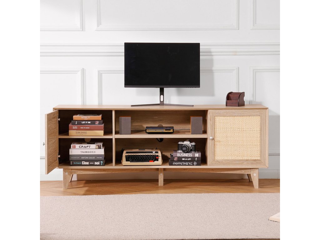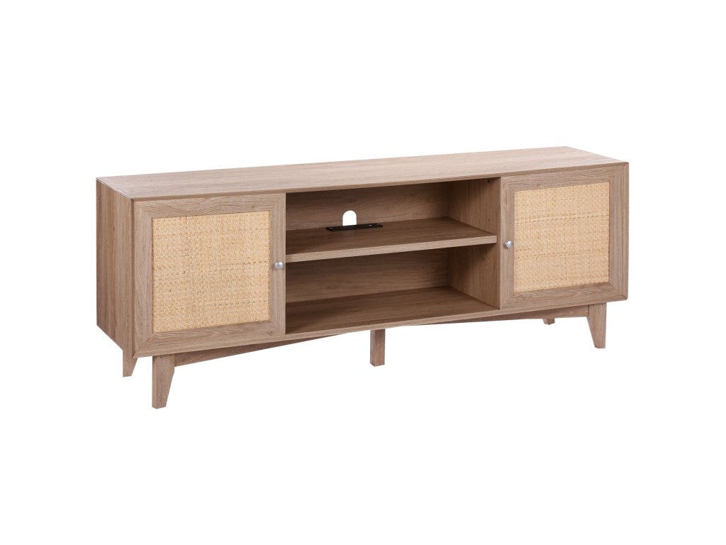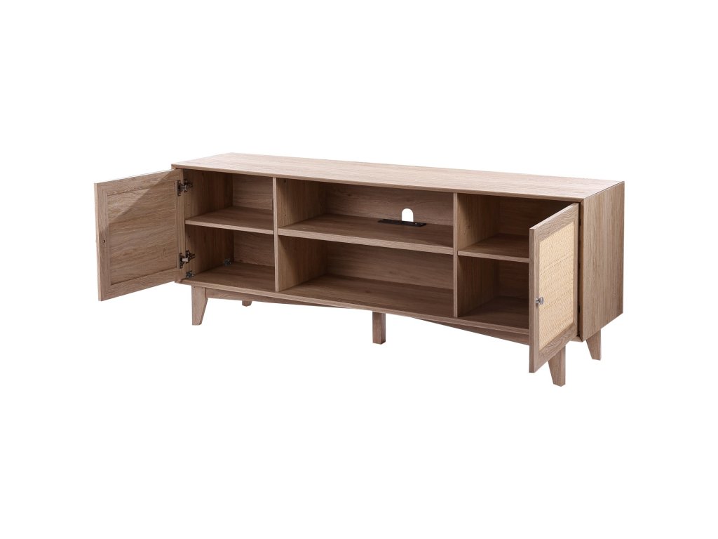 A két oldalán lévő nagy rattan szekrényekkel magánéletet és szervezettséget biztosít. A középső nyitott polc magassága 0 és 64 mm között állítható, és bőséges tárolóhelyet biztosít DVD-k, hangeszközök, CD-k és könyvek számára.