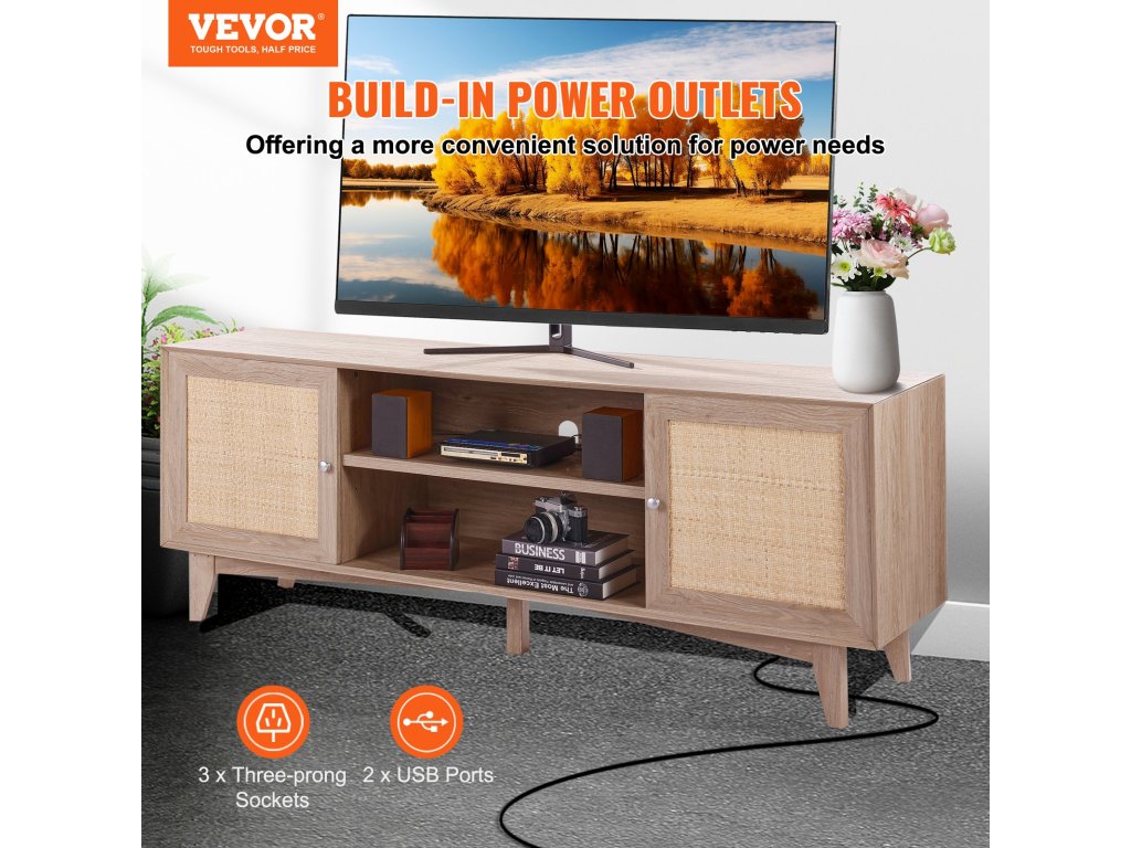Ez a rattan TV-asztal a középső polcon beépített konnektorral rendelkezik a könnyű áramcsatlakozás és a kábelvezetés érdekében, így kényelmesebbé teszi a nappalit.