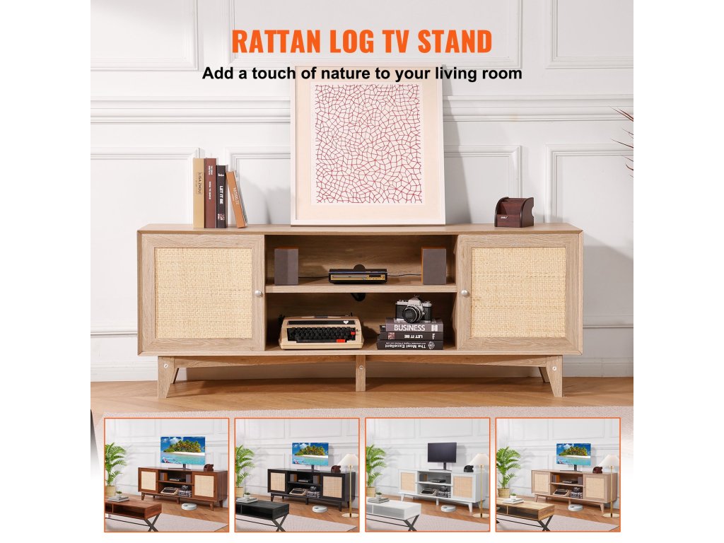 A rattan TV-asztalunk a rattan és a tömörfa kombinációja egy elegáns, modern dizájnban. Használhatja tévéállványként a hálószobában vagy a nappaliban, vagy vitrineként az előszobában vagy a dolgozószobában, természetes melegséget kölcsönözve otthonának.