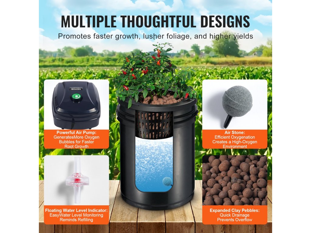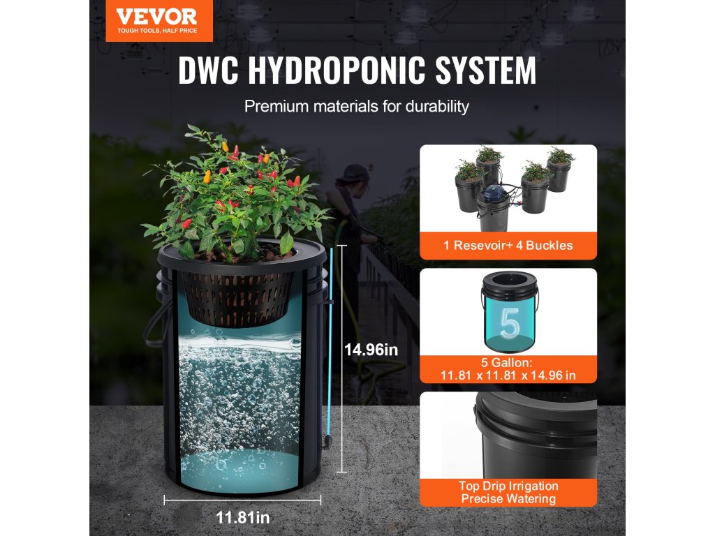 Az RDWC hidroponikus készlet négy 5 Gal vödörrel és 8" nyílású ültetőkosárral rendelkezik, amelyek lehetővé teszik a különböző zöldségek és gyümölcsök termesztését. A precíziós felső csepegtető öntözés jó tömítéssel, fokozza a könnyebb vízfelvételt.