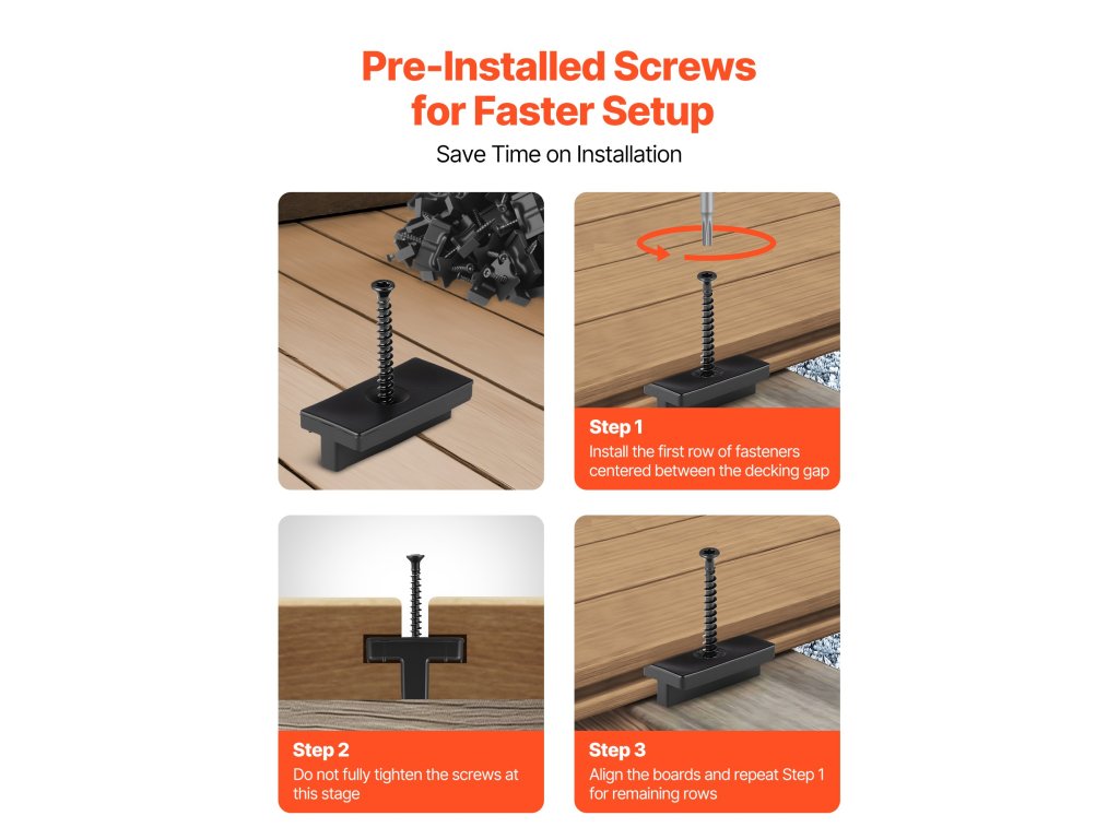 Tartalmaz lépésről-lépésre történő útmutatót a gyors és egyszerű telepítéshez - még a kezdők is könnyedén felszerelhetik ezeket a rögzítőket, amelyek szilárdan a helyén tartják a fedélzeti deszkákat, és megakadályozzák a mozgást vagy a vetemedést.