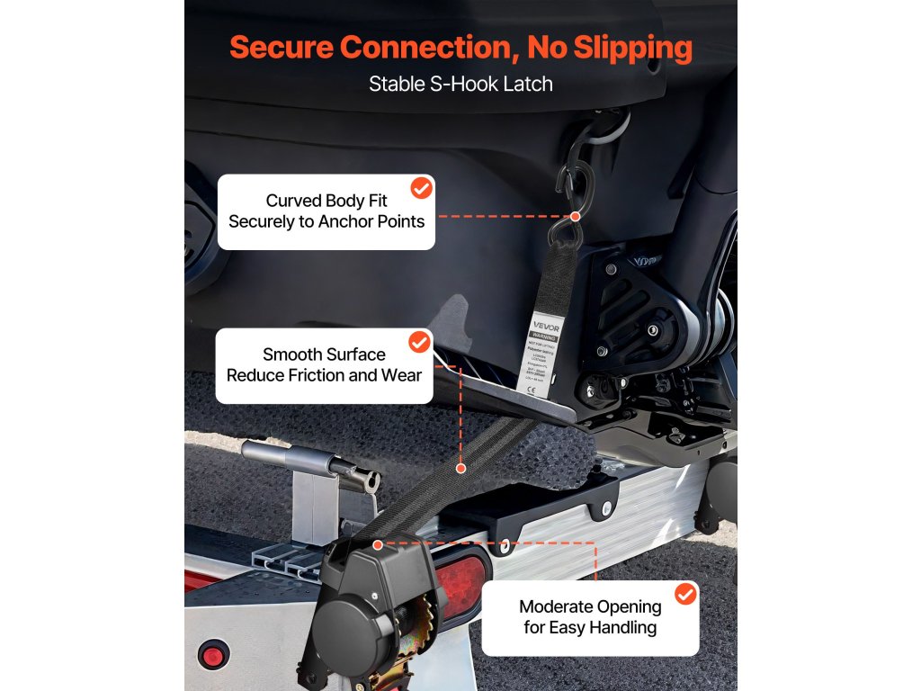 Az S-kampókkal felszerelt autós rögzítő készletünknek köszönhetően járművének rögzítése gyors és egyszerű. Csatlakoztassa a tengely egy fix pontjához, húzza meg erősen a racsnit, és minden alkalommal minimális erőfeszítéssel stabil beállítást érhet el.