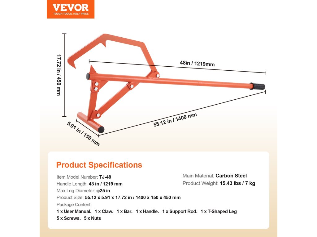 A 46,5" hosszú nyéllel rendelkező rönkemelő a kar elvét használja, hogy könnyedén felemelje a rönköket a vágáshoz. A rönkemelő vaskampójának furata állítható, és legfeljebb φ25'' kerek rönkökhöz használható. Használhatja láncfűrésszel, fa hasítóval a fa vágásához.