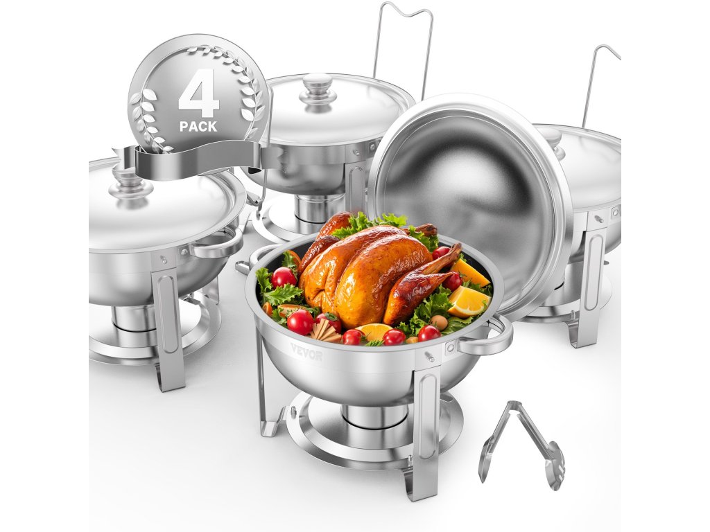 Rozsdamentes acél melegítőtál készlet 4 db 5 literes, 4 teljes méretű serpenyő, állvány