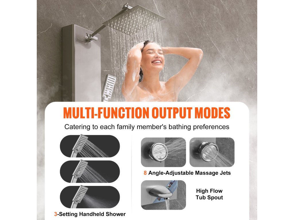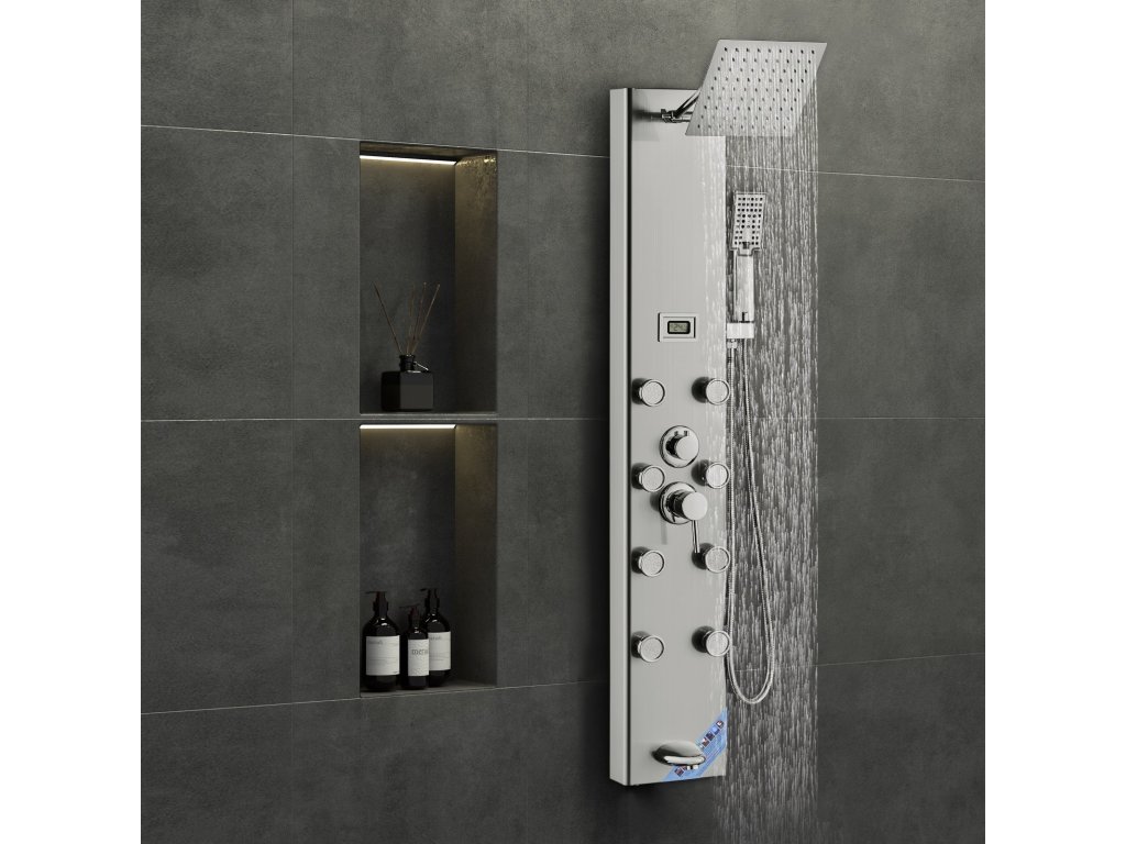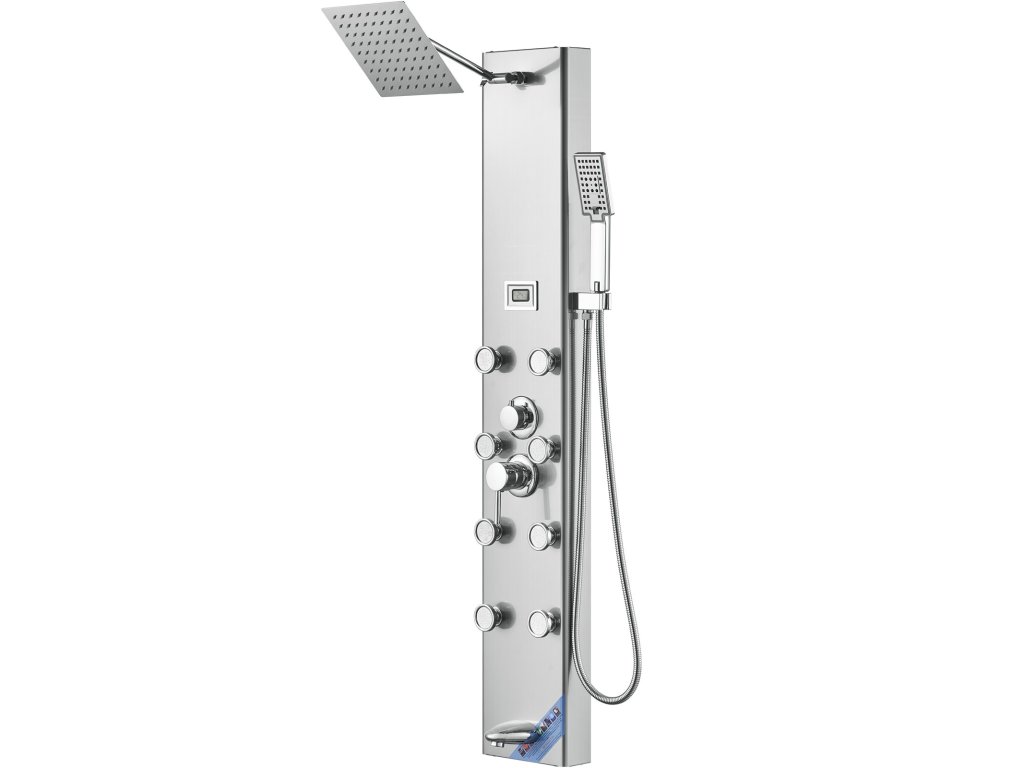 Rozsdamentes acél zuhanypanel, 6 üzemmód, 8 fúvóka, 3 pozíciójú kézi zuhany, 59"-os gégecső