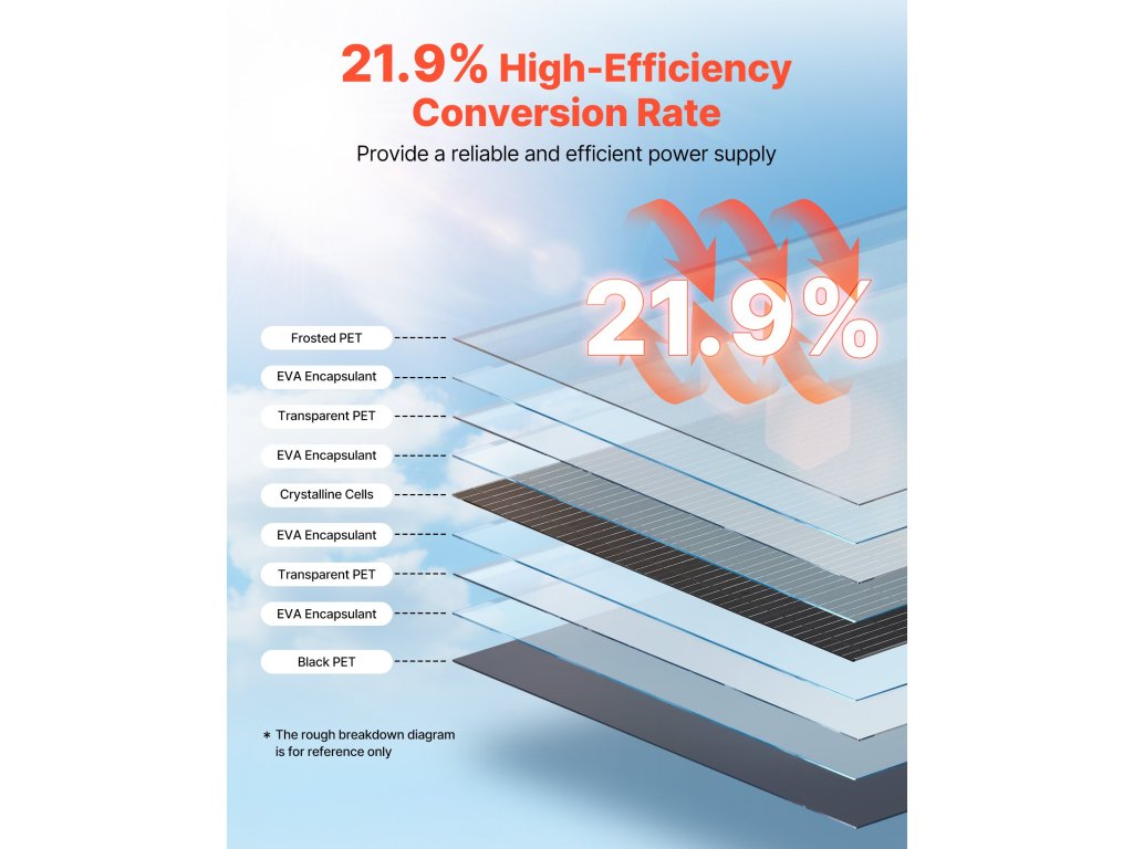 Élvezze a megbízható energiát igény szerint a nagy hatékonyságú monokristályos napelemekkel. Átalakítási hatásfokával ≥ 21,9%, stabil és egyenletes teljesítményt biztosít, hogy eszközei mindig energiával legyenek ellátva.