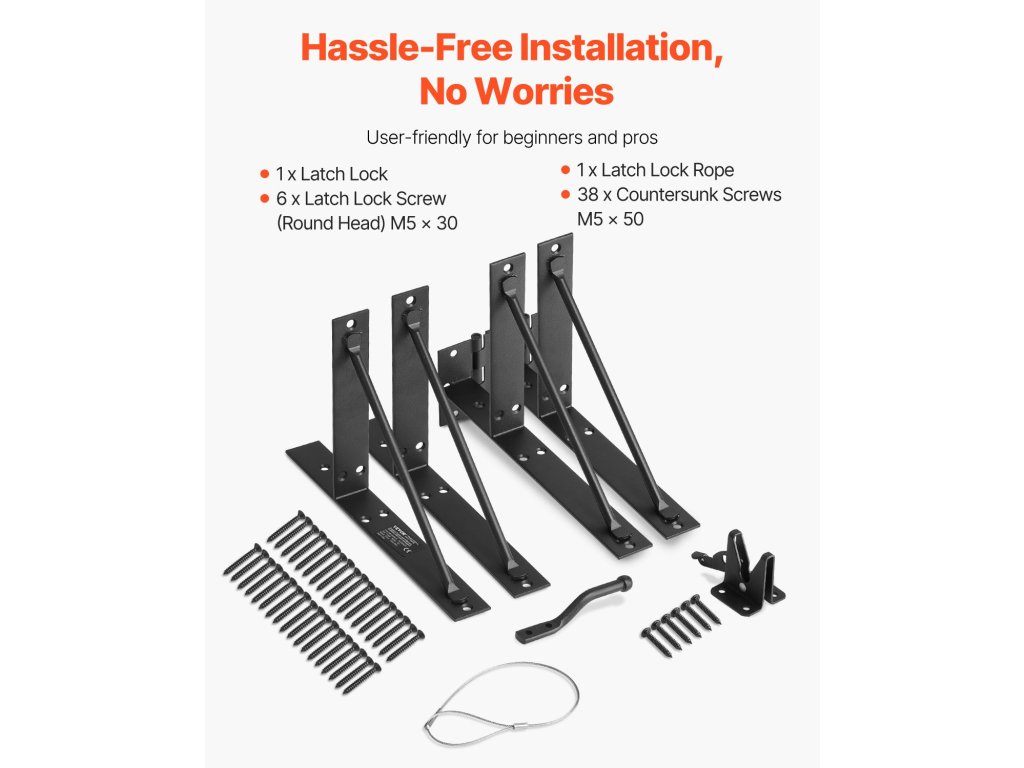 A kapukeret-készlet tartalmaz egy reteszt és csavarokat, részletes szerelési útmutatóval. Nincs szükség szögmérésre, így a telepítés még a kezdők számára is gyors.