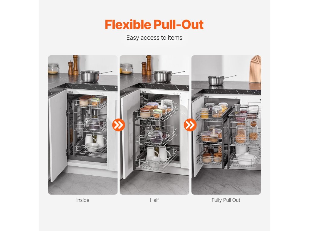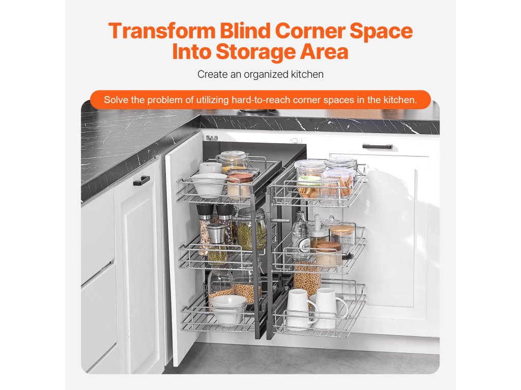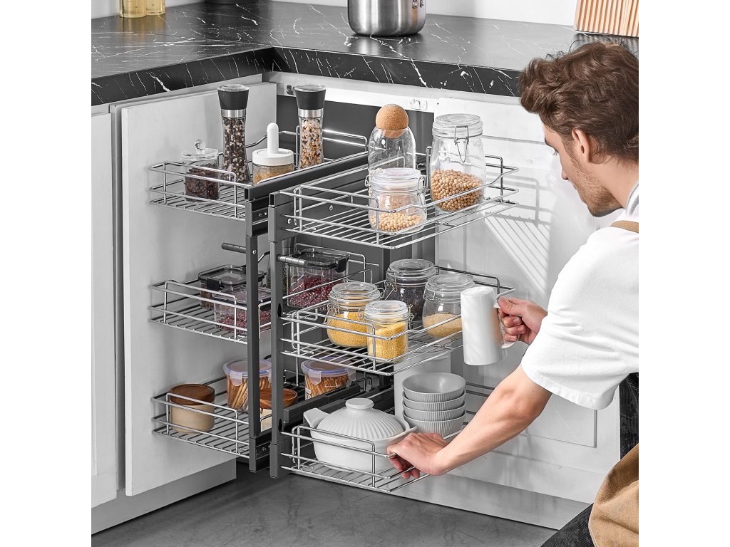 A vak sarokrendezőnket úgy terveztük, hogy a konyha sarkában lévő vakfoltok kezelésére szolgáljon, és segítsen a hely hatékony kihasználásában. A nagy kapacitású kialakításnak köszönhetően könnyedén tárolhat különféle konyhai tárgyakat, így simán kihúzhatja őket anélkül, hogy aggódnia kellene a nehezen elérhető sarokelemek miatt.