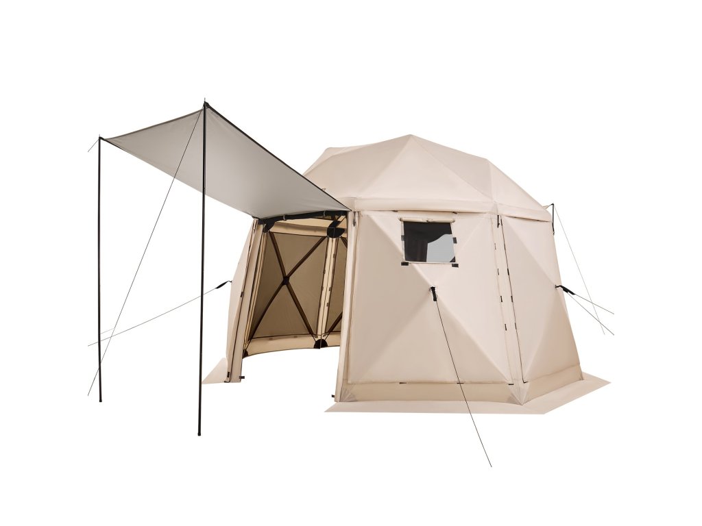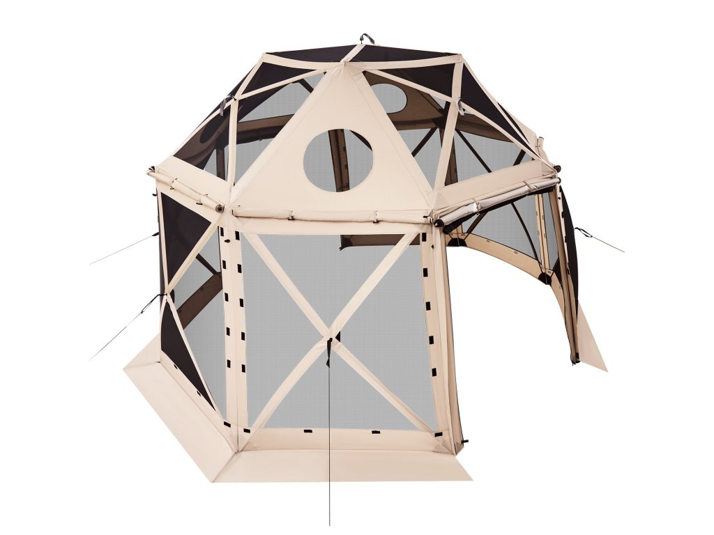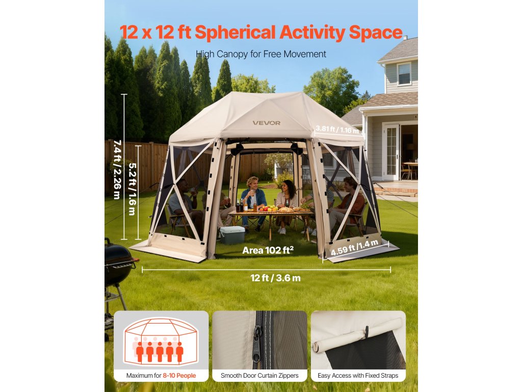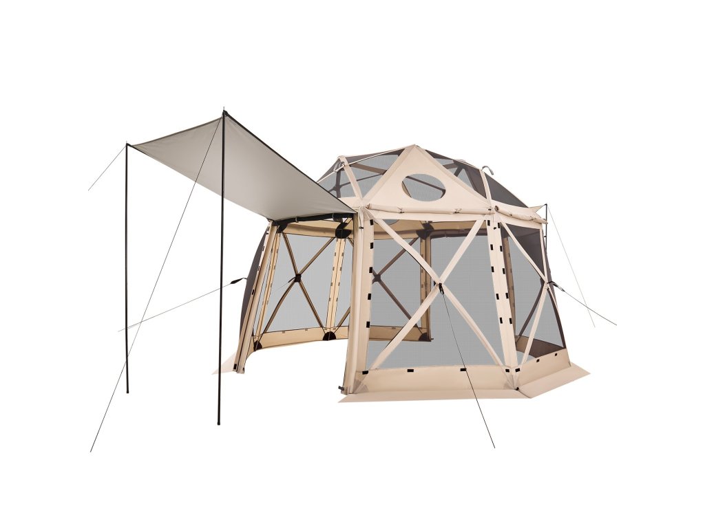 Ez a pavilonnal ellátott kemping sátor bőséges helyet kínál az árnyékban végzett tevékenységekhez a család és a barátok szabadtéri összejöveteleihez. A nagyméretű, 12×12 láb méretű, árnyékot adó pavilonsátorban 8-10 személy is elfér. 4 láb hosszú, 7-es tetejű baldachin biztosítja a kényelmes állási magasságot.