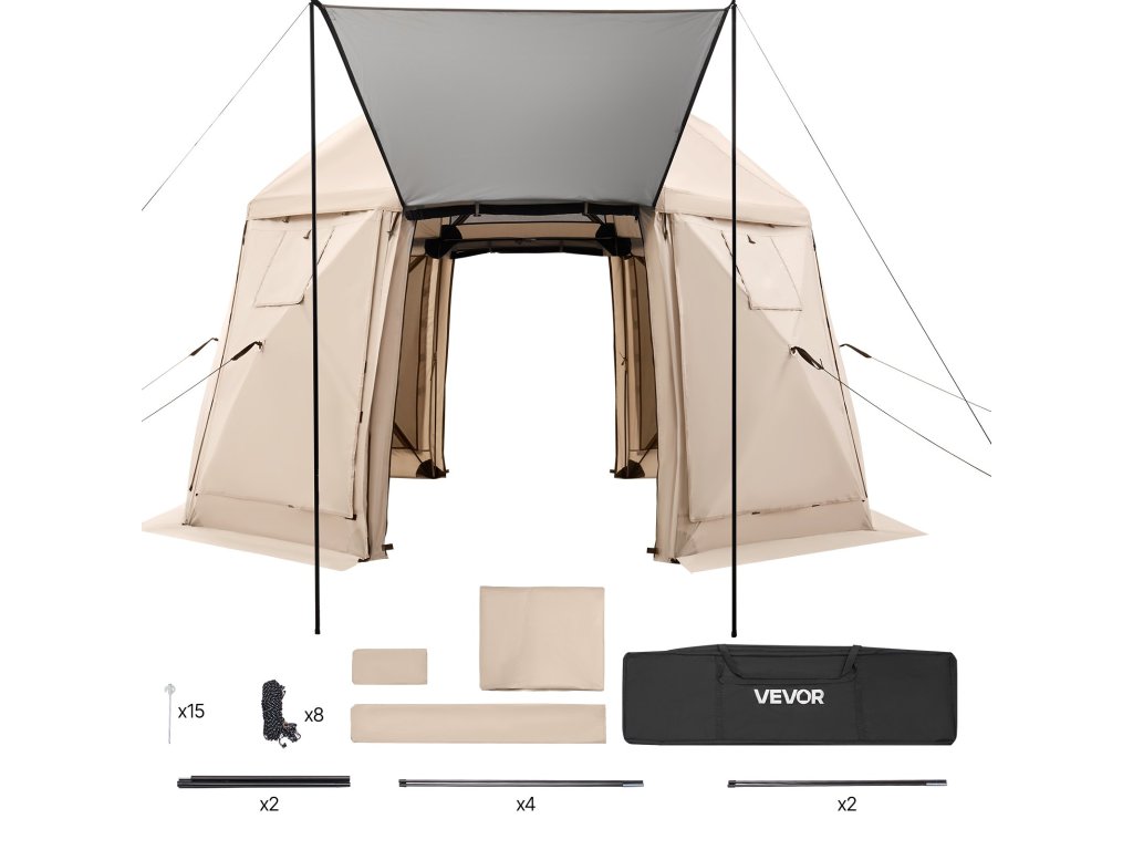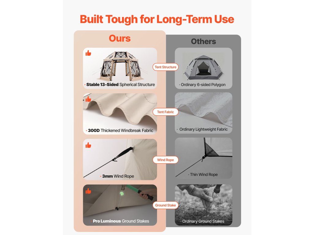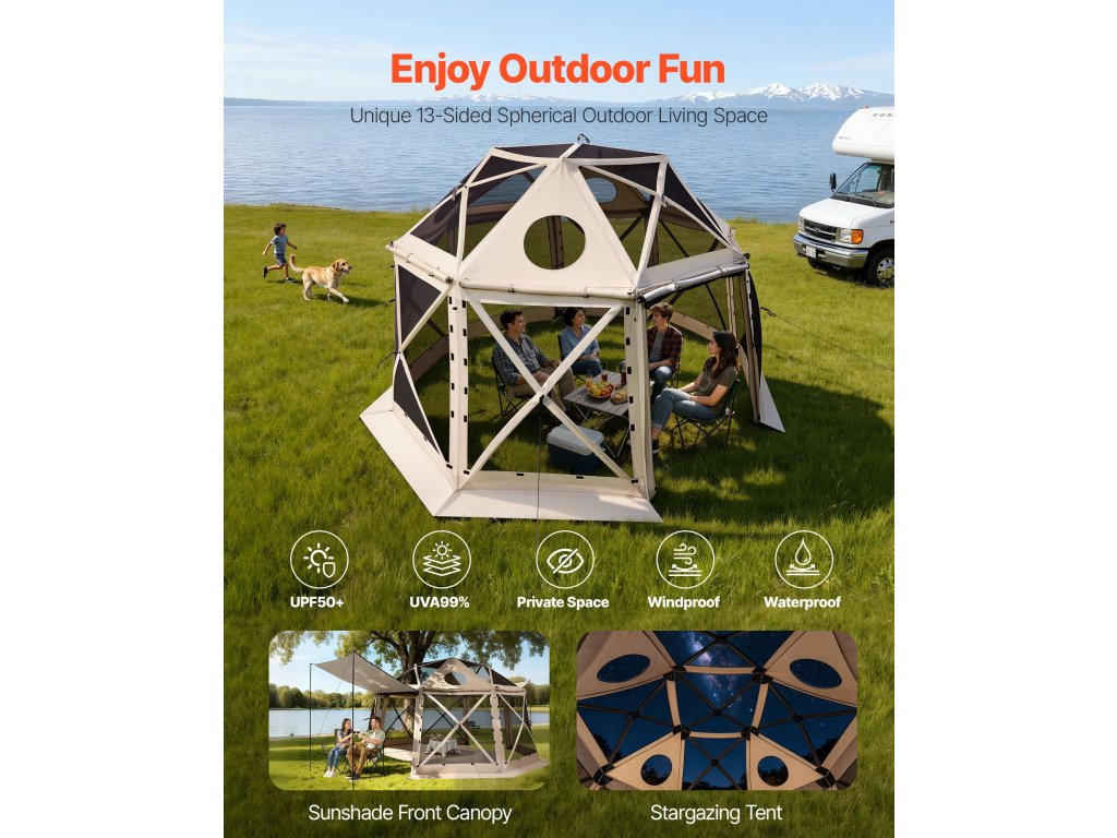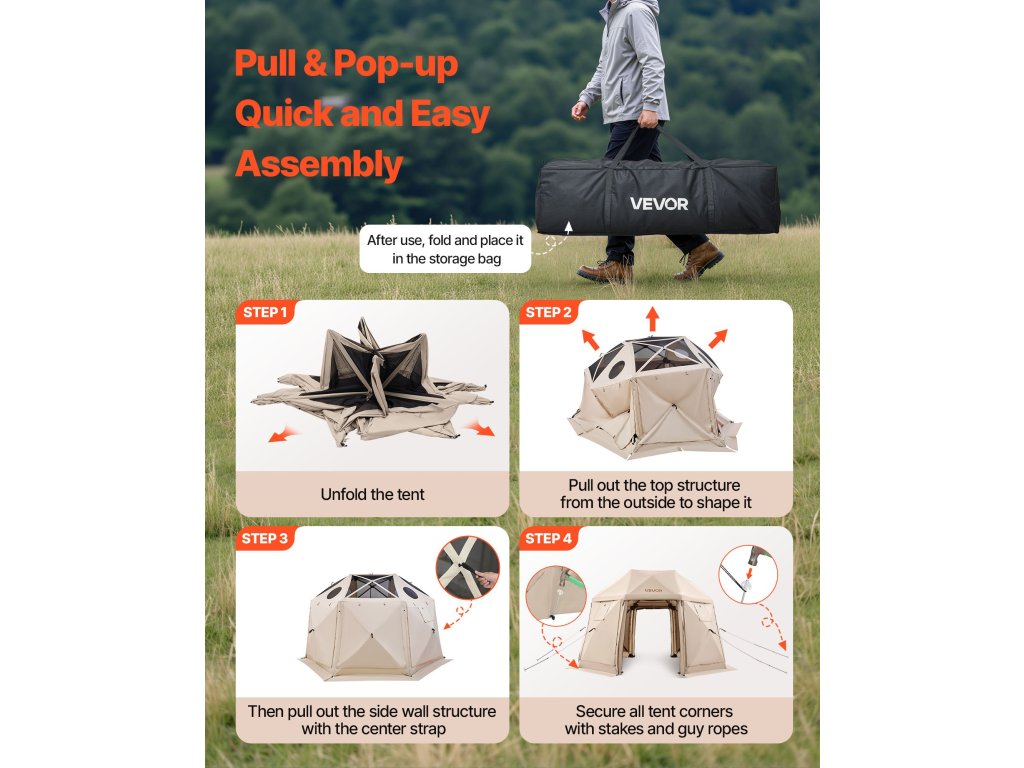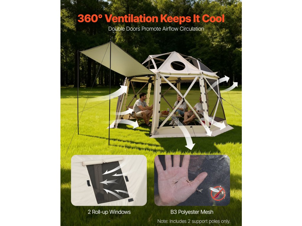 Ez a pavilonnal ellátott kemping sátor bőséges helyet kínál az árnyékban végzett tevékenységekhez a család és a barátok szabadtéri összejöveteleihez. A nagyméretű, 12×12 láb méretű, árnyékot adó pavilonsátorban 8-10 személy is elfér. 4 láb hosszú, 7-es tetejű baldachin biztosítja a kényelmes állási magasságot.