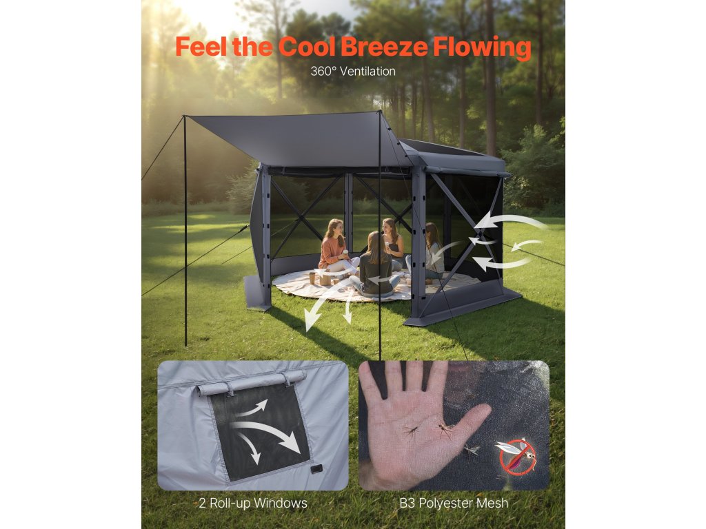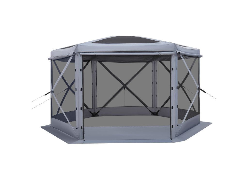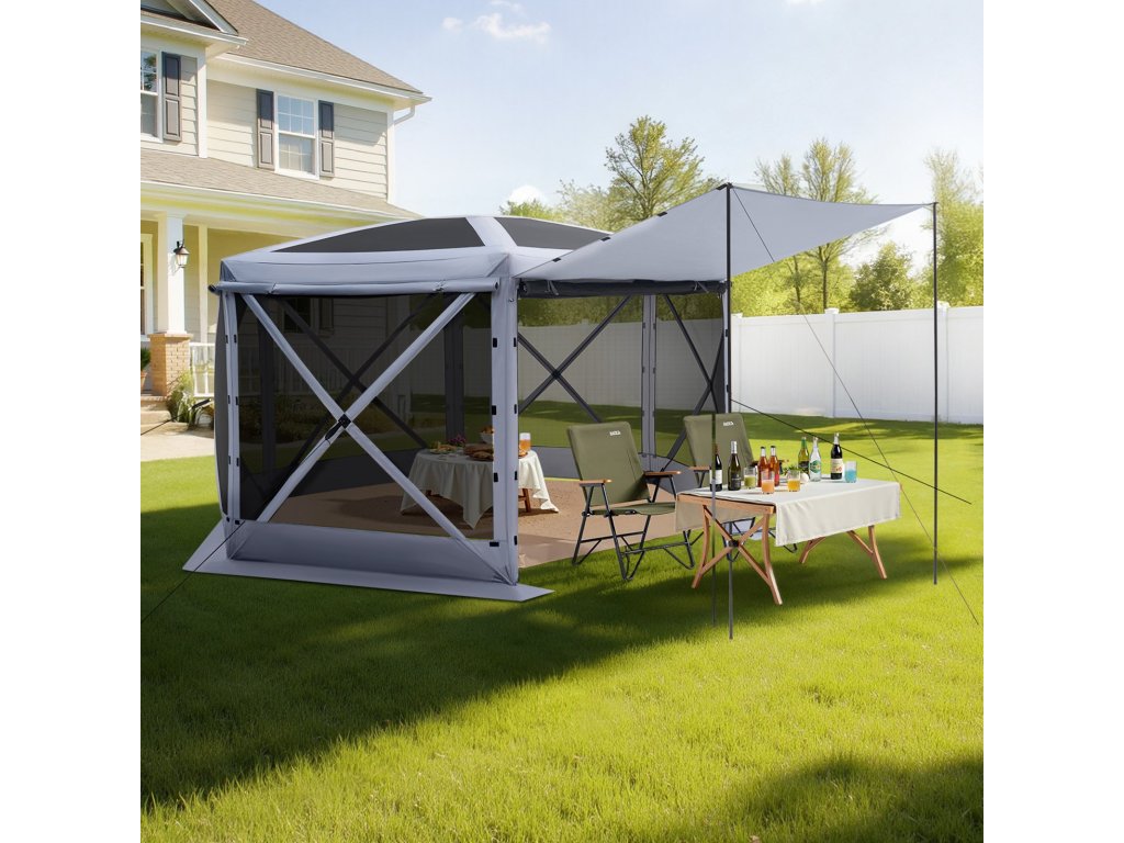 Nagy pavilon képernyővel tágas területet kínál a tevékenységekhez és a családi és baráti összejövetelekhez.A 12x12 lábas méret 8-10 ember befogadására alkalmas.A 2 láb magas 7. lombkorona lehetővé teszi a kényelmes állást és mozgást.