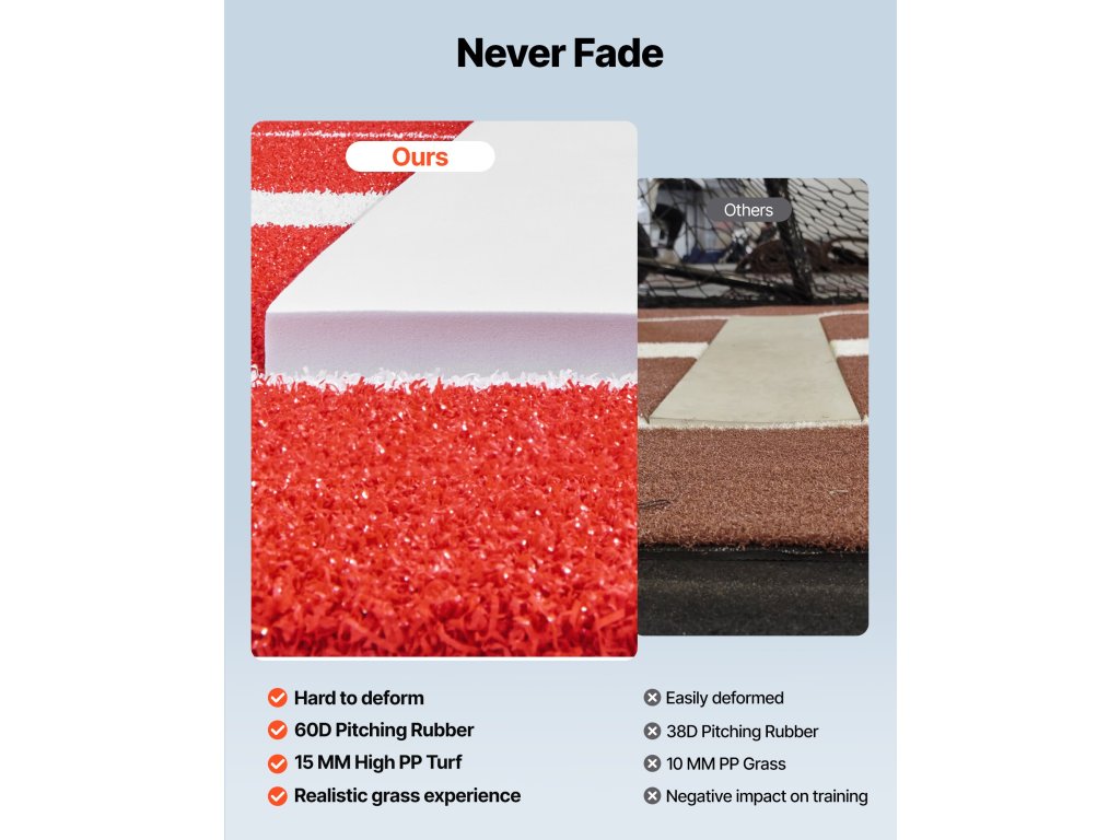 A softball dobópadunk új szintetikus gyepből készül. A magasabb és sűrűbb szőnyeg biztosítja a tartósságot, és ellenáll a lepattogzásnak vagy kifakulásnak. Hosszú távú használatot is kibír, és használható stoplisokkal vagy stoplisokkal ellátott ütőfelületekkel is.
