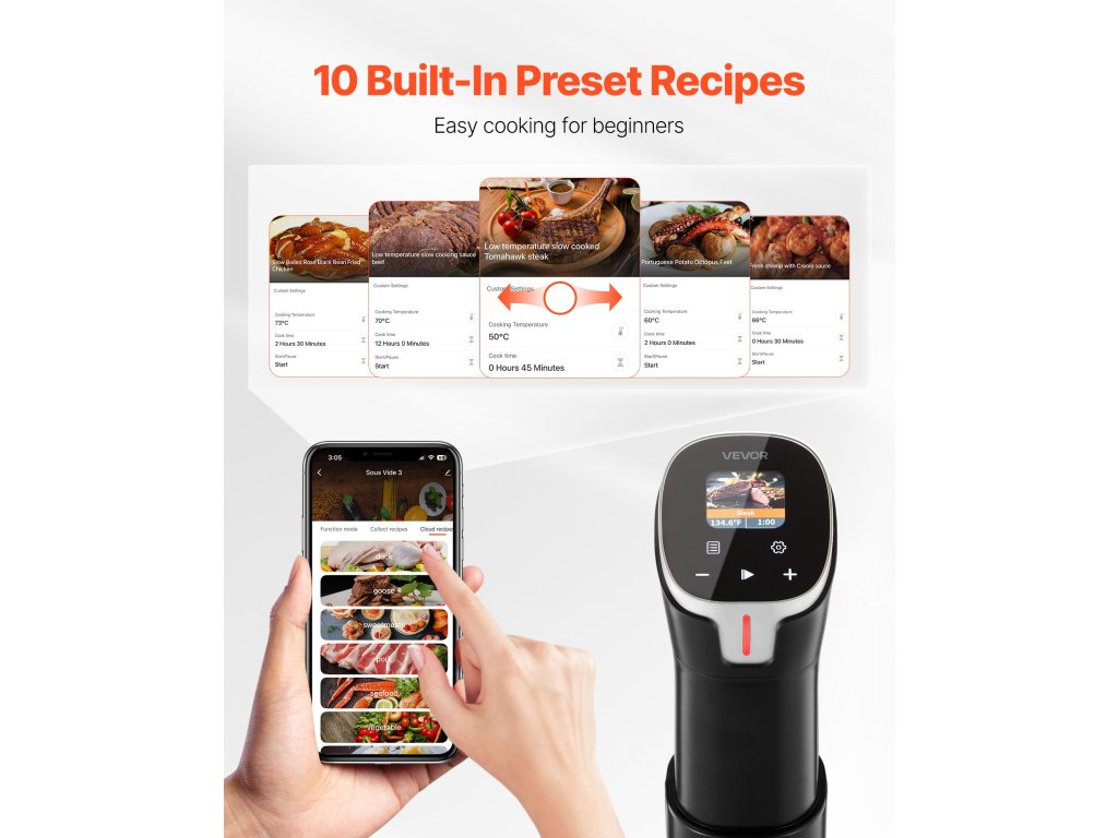 Professzionális sous vide főzőnk mindössze három egyszerű lépésben egyszerűsíti a főzést: rögzítse a terméket, adja hozzá a hozzávalókat, és állítsa be az időt az érintésvezérlő vagy az alkalmazás segítségével. Nincs szükség haladó főzési ismeretekre, így még a kezdők is elkészíthetik az ízletes steakeket, tenger gyümölcseit és egyebeket.
