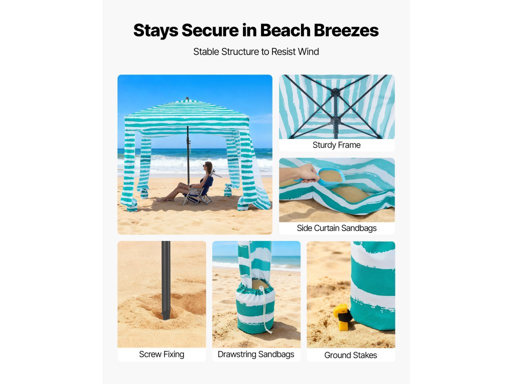 Strandkabinunk tágas, árnyékos területet biztosít családja és felszerelése számára. Így mindenki kényelmesen érezheti magát, és teljes mértékben élvezheti a strandon töltött időt anélkül, hogy szűkösnek érezné magát.