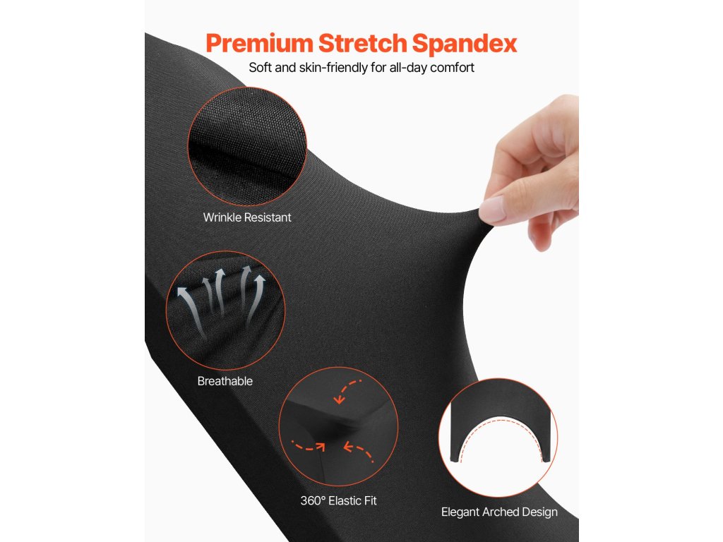 A spandex székhuzatok 95% poliészterszálból és 5% spandexből készülnek, amelyek az erős anyagoknak és a minőségi varrásnak köszönhetően extra kényelmet és rugalmasságot biztosítanak. A sokoldalú székhuzatokat úgy tervezték, hogy megvédjék székeit a véletlen kiömlött folyadékoktól, a háziállatok karcolásaitól, a mindennapi foltoktól és szakadásoktól.