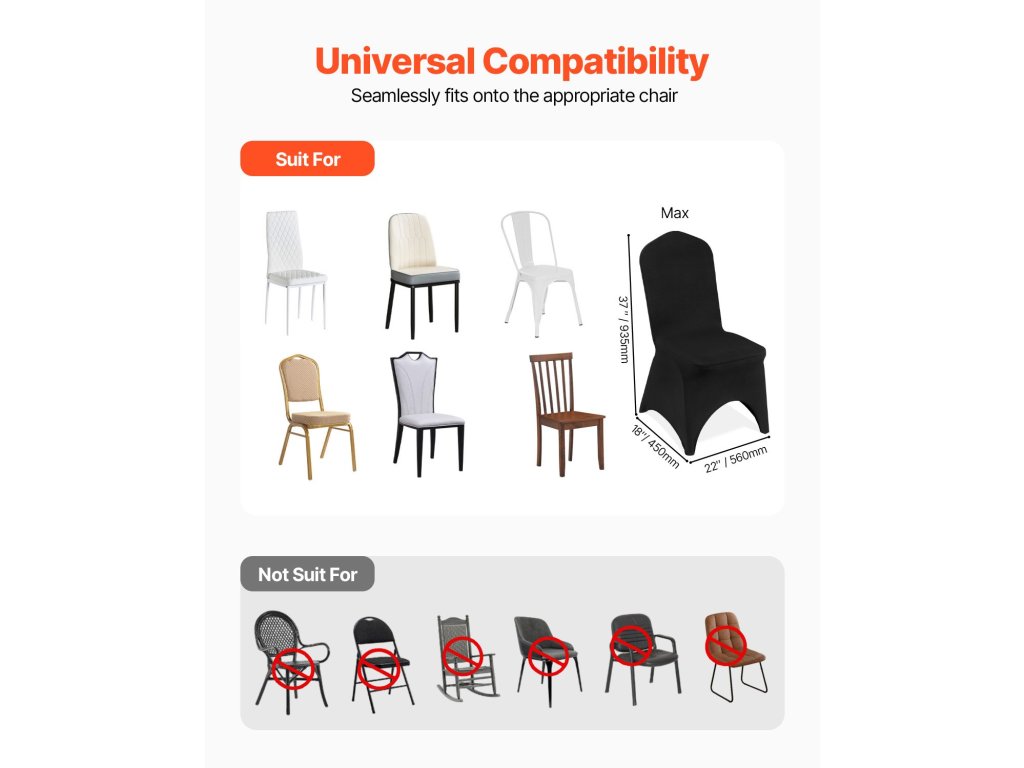 Az univerzális illeszkedésű székhuzatvédők közepes méretűek; a stretch étkezőszékhuzatok a legtöbb székre (karfa nélkül) felszerelhetők, beleértve az étkezőszékeket, az egymásra rakható székeket és a bankett székeket.