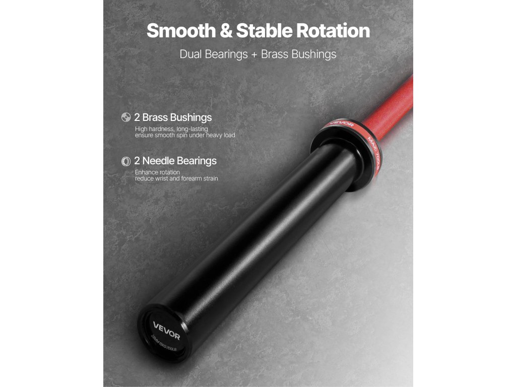 Az erősítő rúd 2 sárgaréz persellyel és 2 tűcsapággyal van felszerelve a sima és csendes forgás érdekében. Ez csökkenti a csukló és az alkar megterhelését, védi az ízületeket és egyenletes teljesítményt ér el a fekvenyomásnál, guggolásnál és más nehéz emeléseknél.